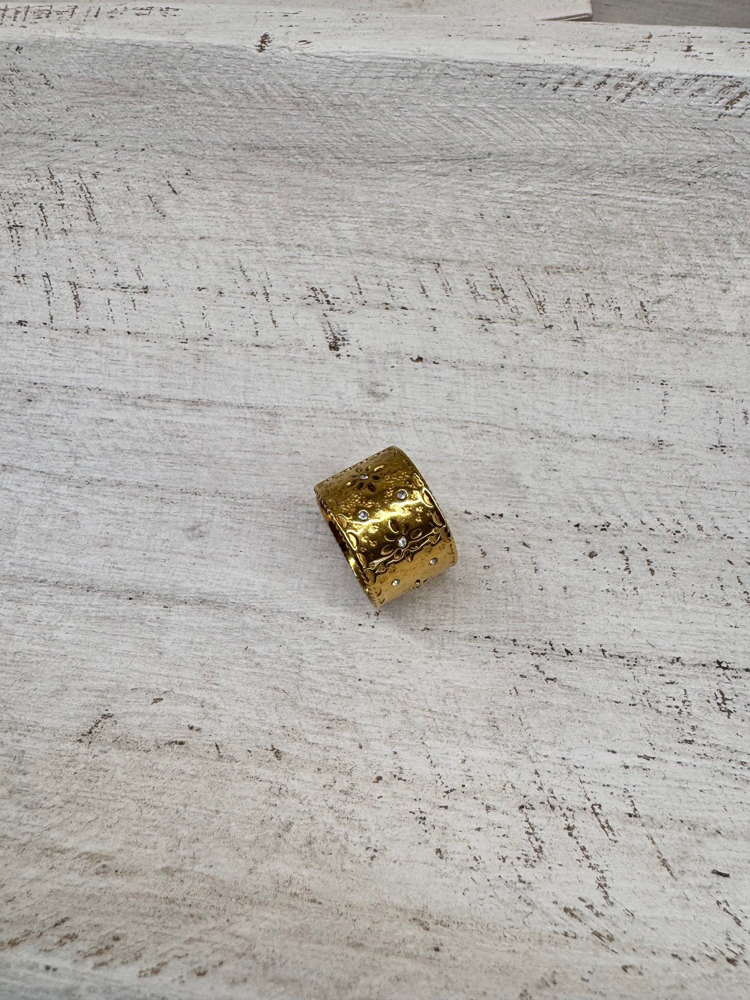 Anillo de acero troquelado con circonitas. Abierto en la parte posterior para poder ajustar.