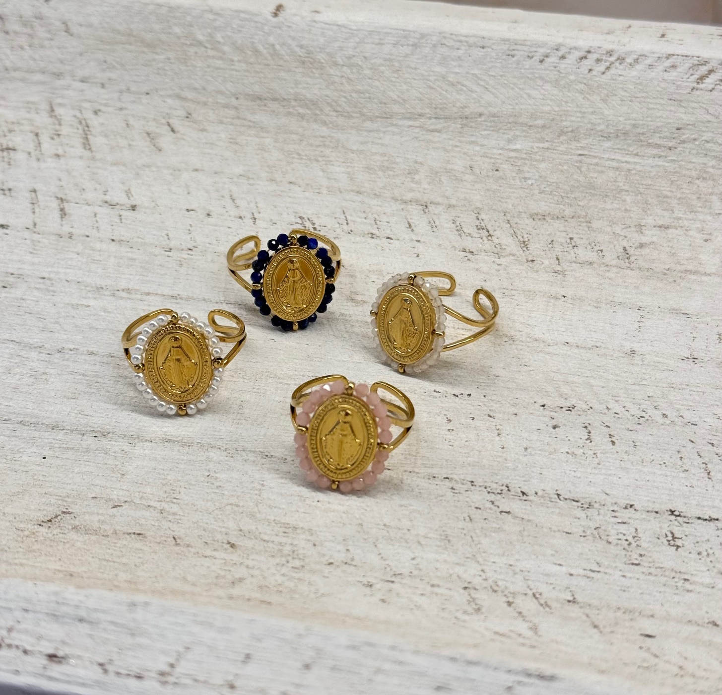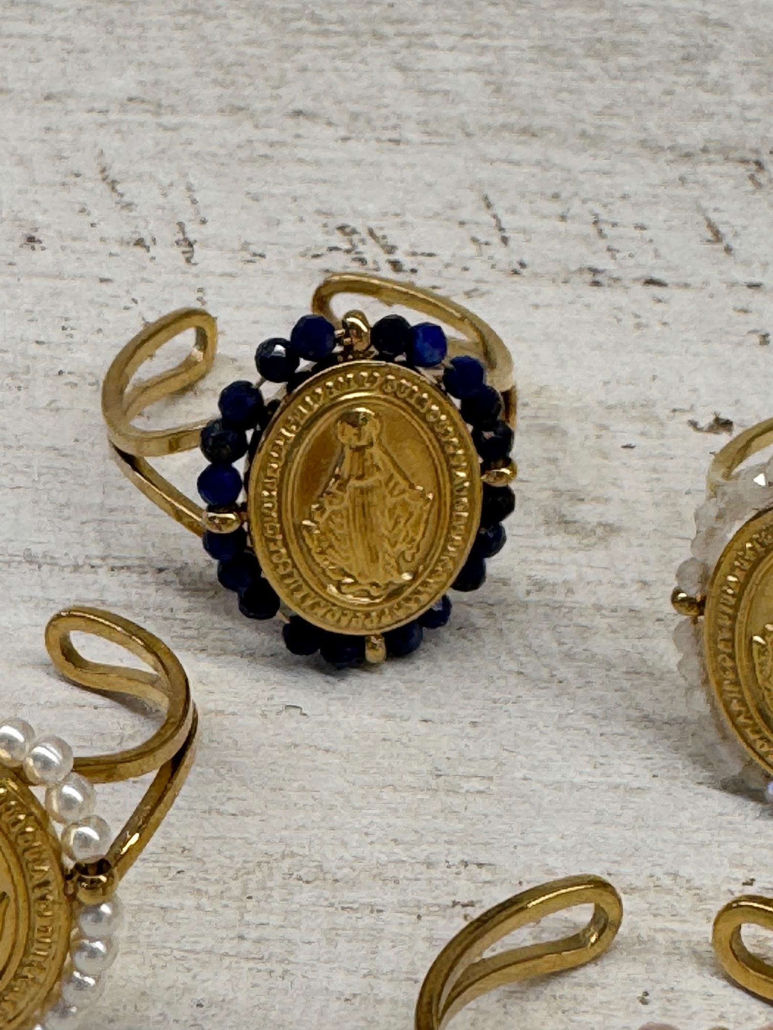 Anillo dorado de acero con imagen de la Virgen de la Milagrosa y piedras. Talla única.