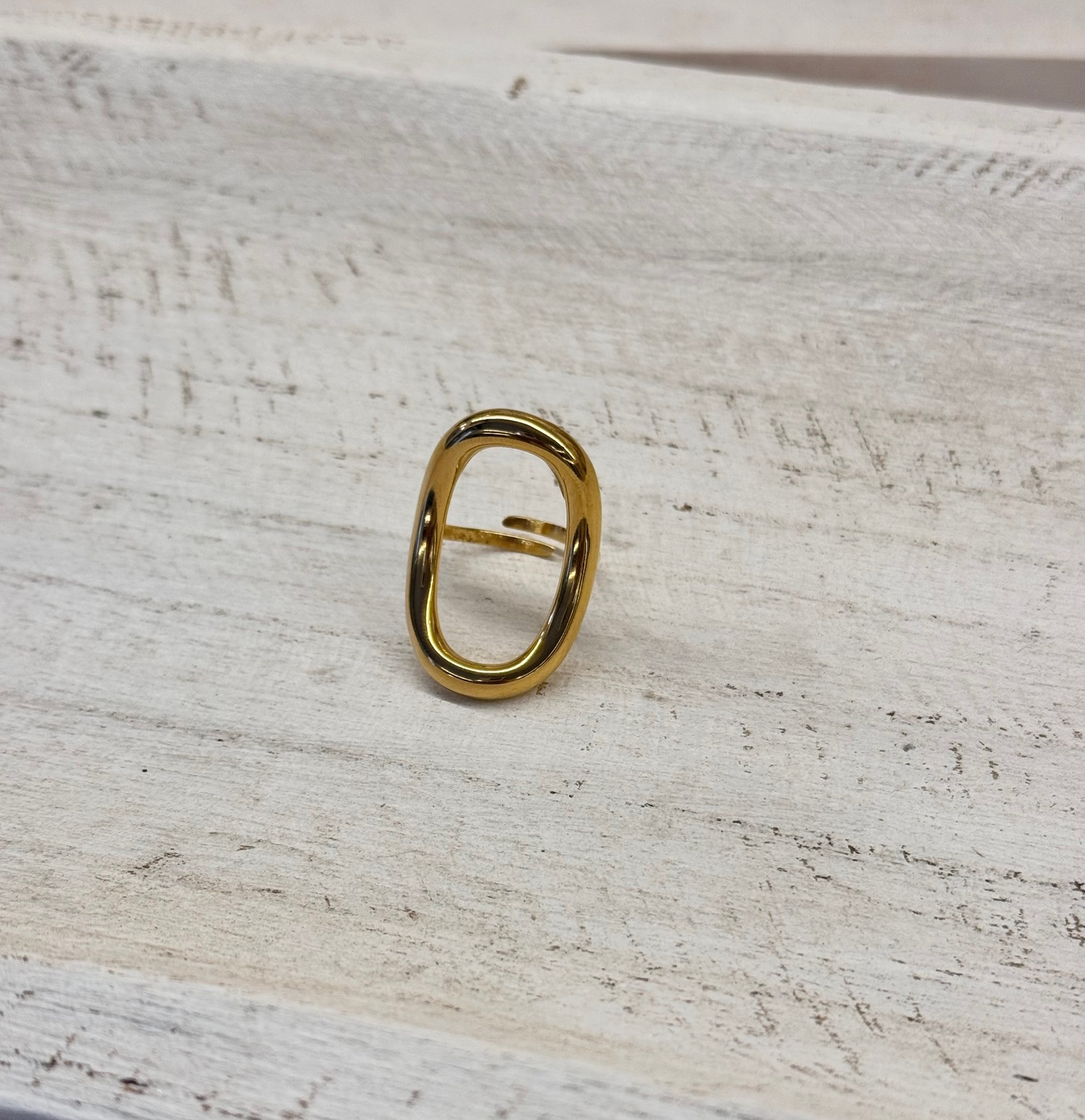 Anillo dorado de acero en forma ovalada. Talla única ajustable.