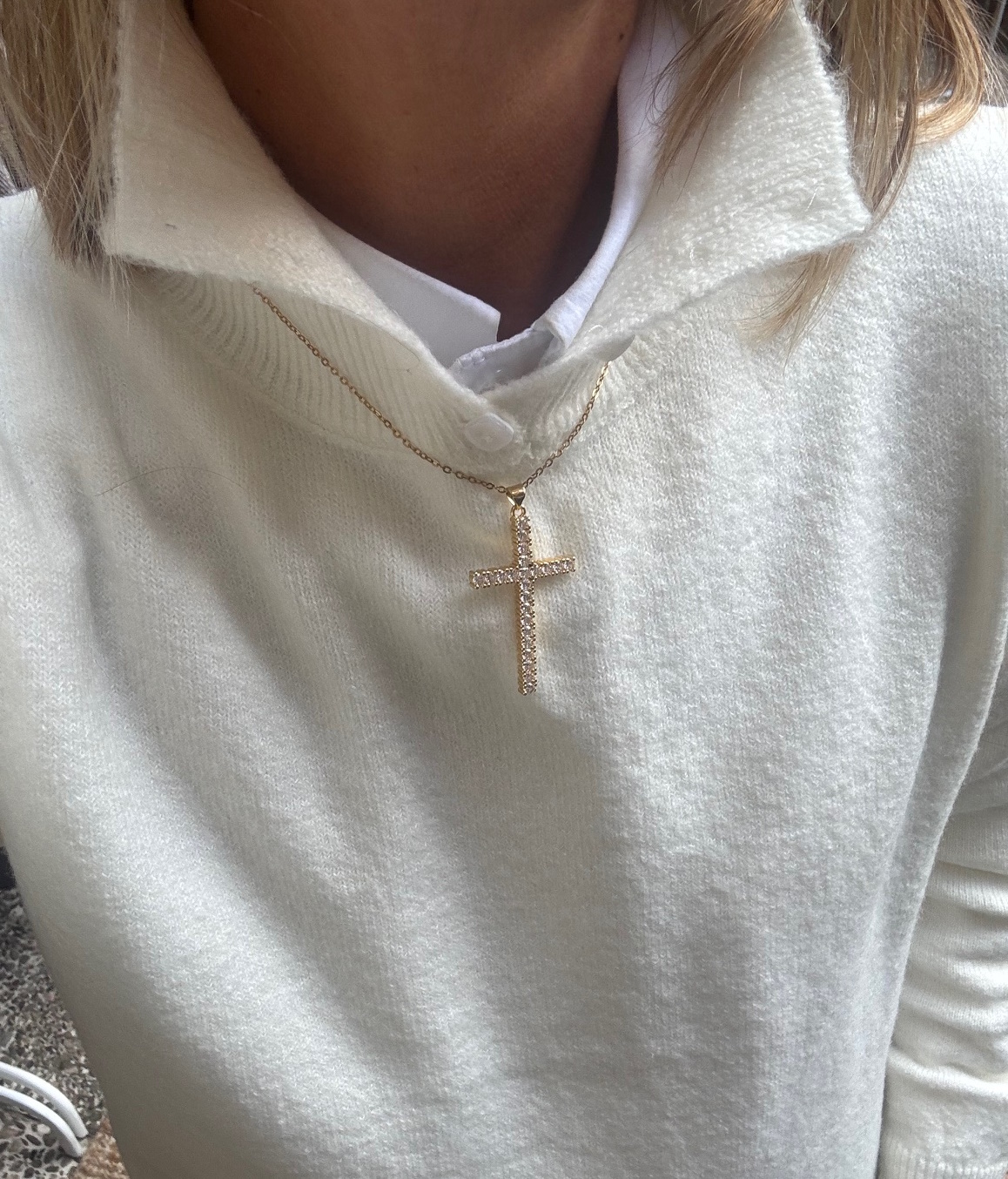 Gargantilla dorada de acero y cruz con circonitas de 2,7cm X4,6cm
