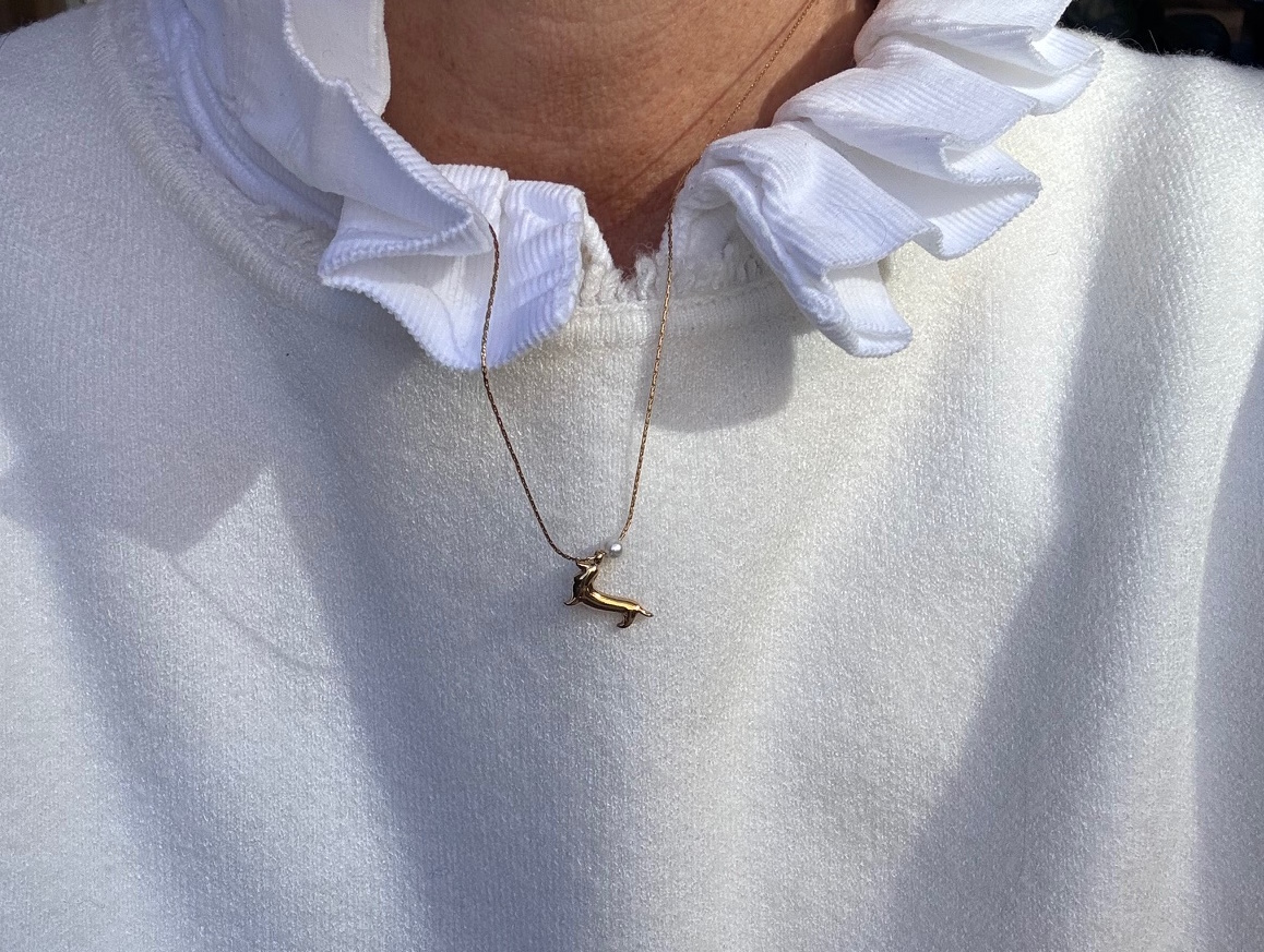 Gargantilla dorada con cordón fino y colgante de mini teckel con perla.