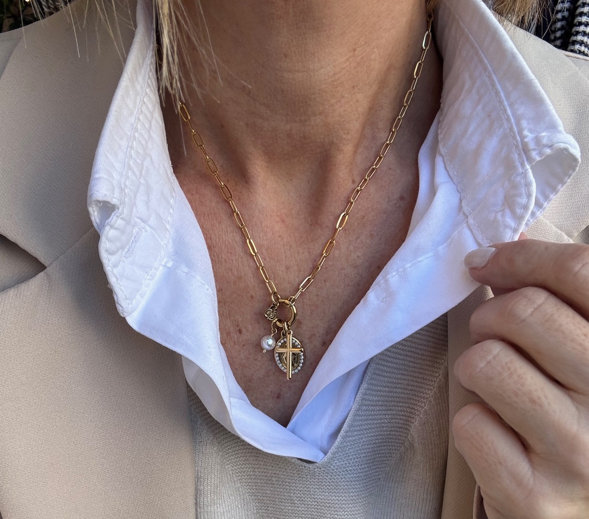 Acero dorado con meda de la Milagrosa, cruz y perlita. Cierre timón en la parte delantera.