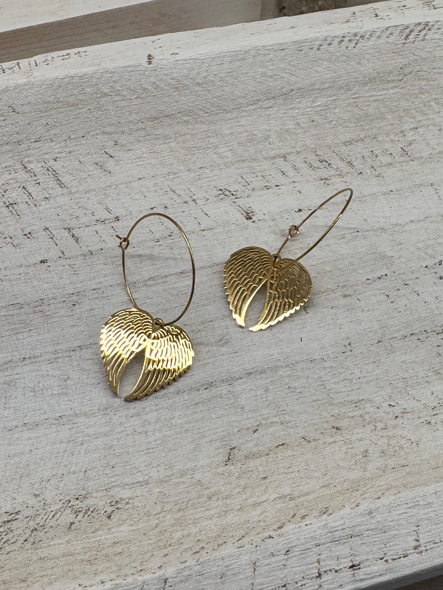 Pendiente de acero dorado con aro fino y alitas colgantes.
