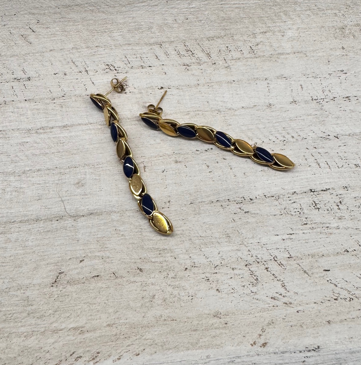 Pendiente largo de acero dorado combina con piezas en azul.
