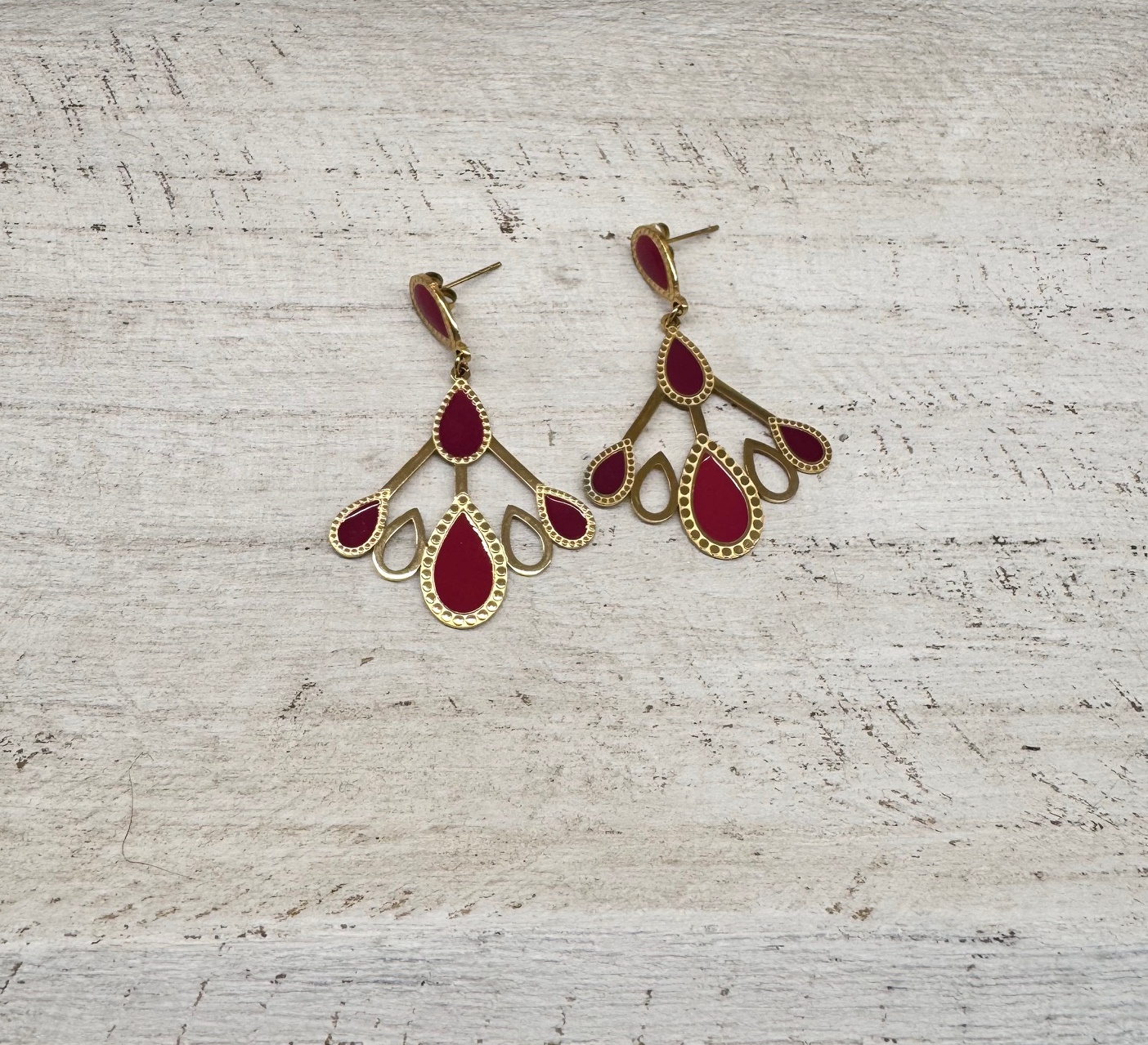 Pendiente dorado de acero combinado con pieza en color frambuesa.