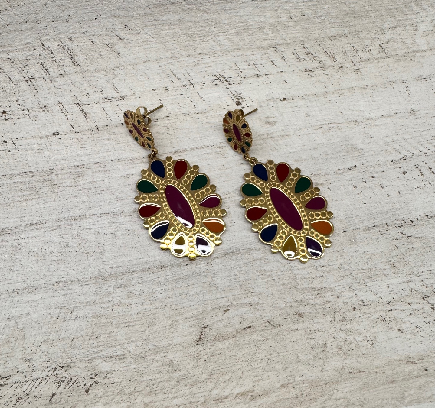 Pendiente de acero con piezas esmaltadas en colores.