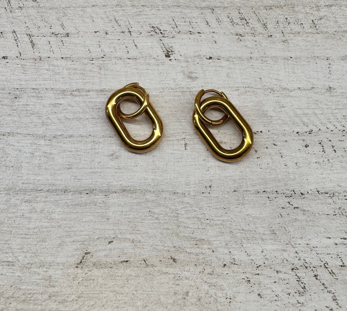 Pendiente dorado de acero con arete pequeño y eslabón ovalado con movimiento.