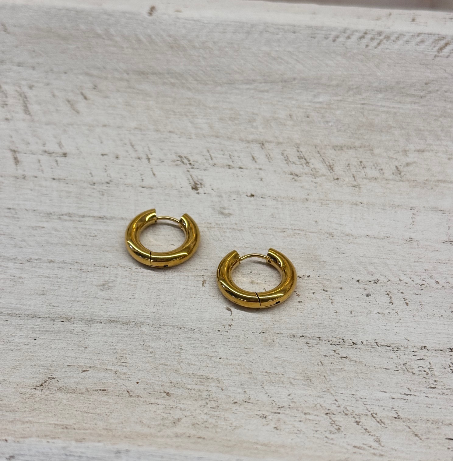 Pendiente de acero dorado en forma de aro tubular.