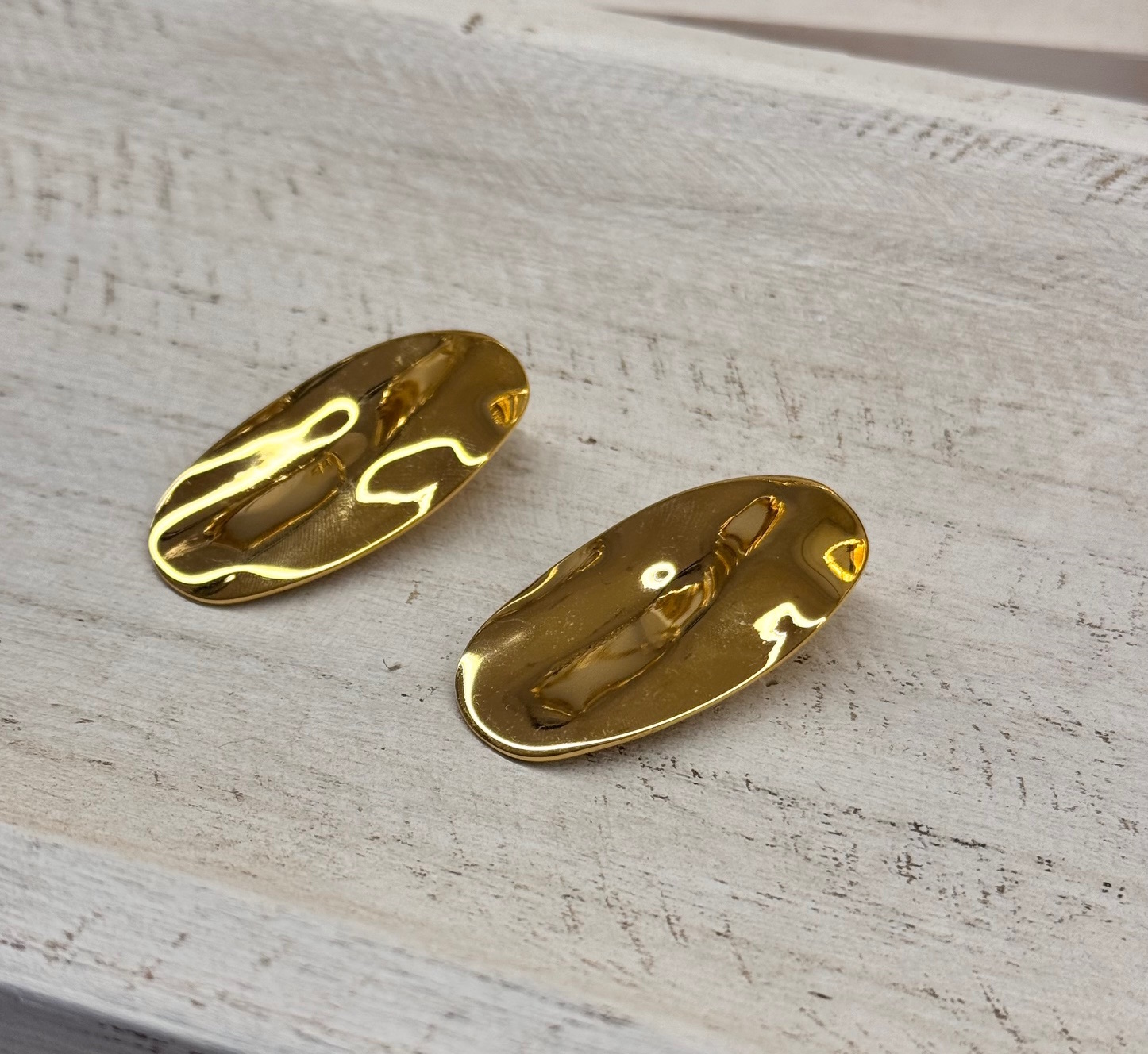 Pendiente de acero dorado en forma ovalada irregular.