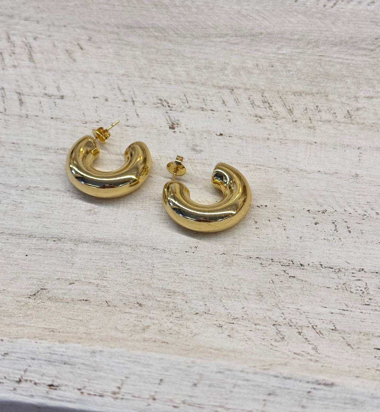 Pendiente de acero dorado en forma de aro tubular hueco. Peso ligero.