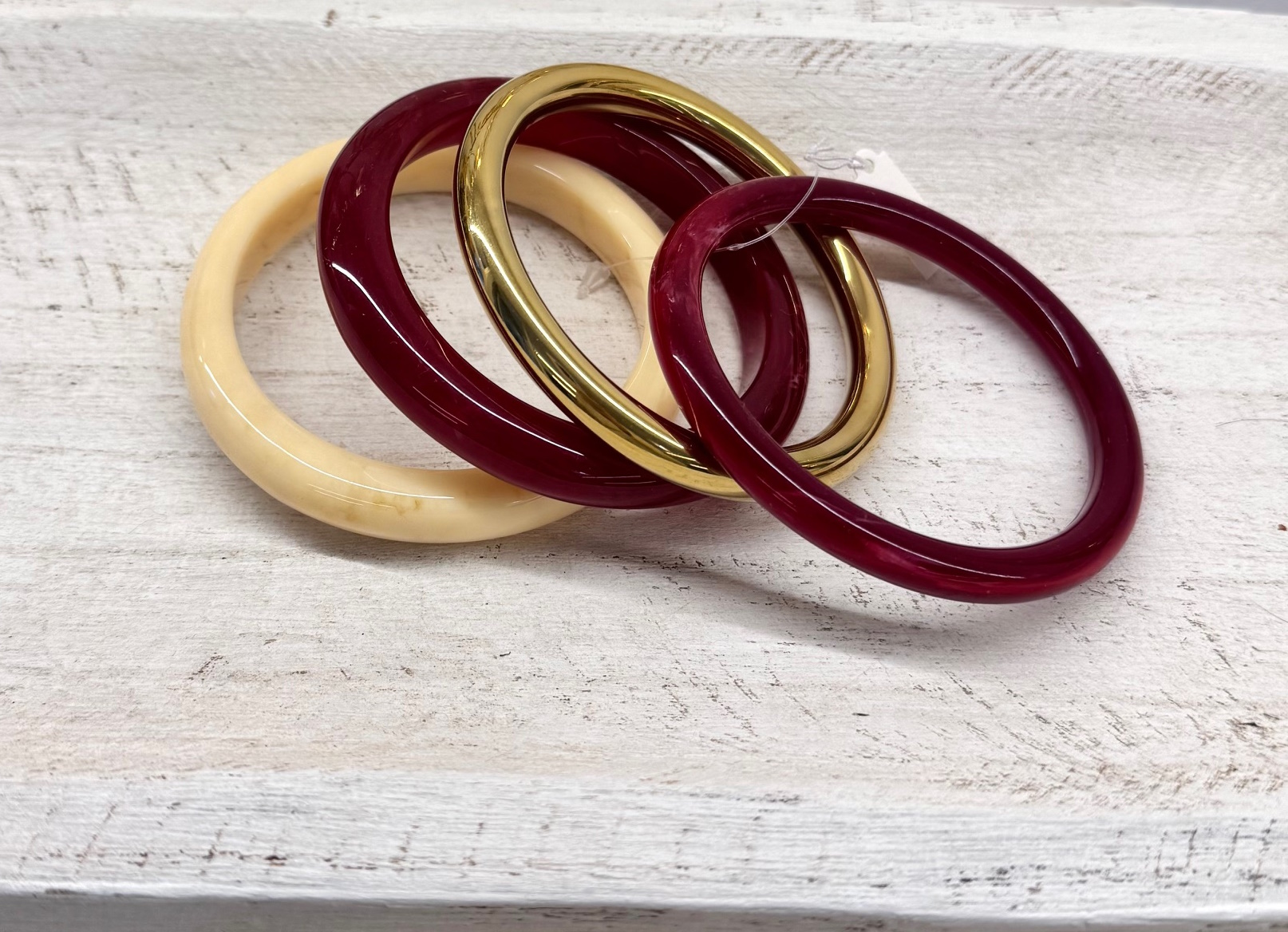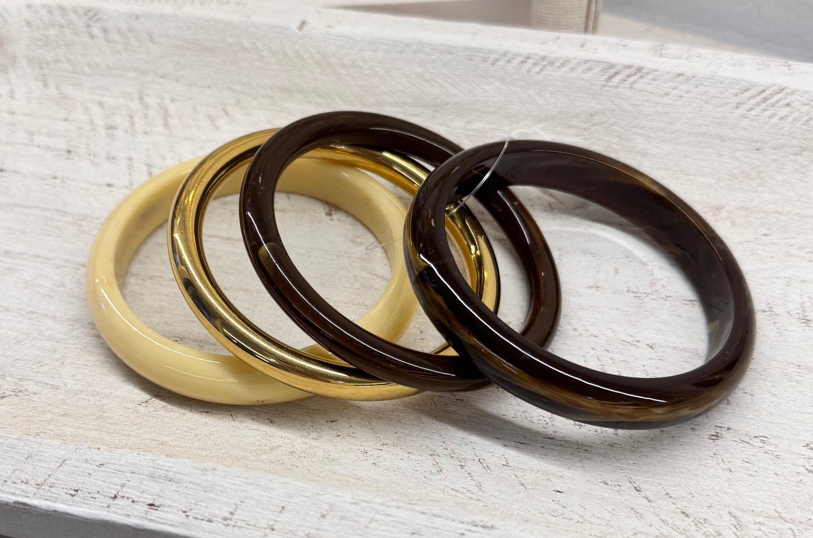 Pack de cuatro pulseras combinadas en resina, crudo y dorado.