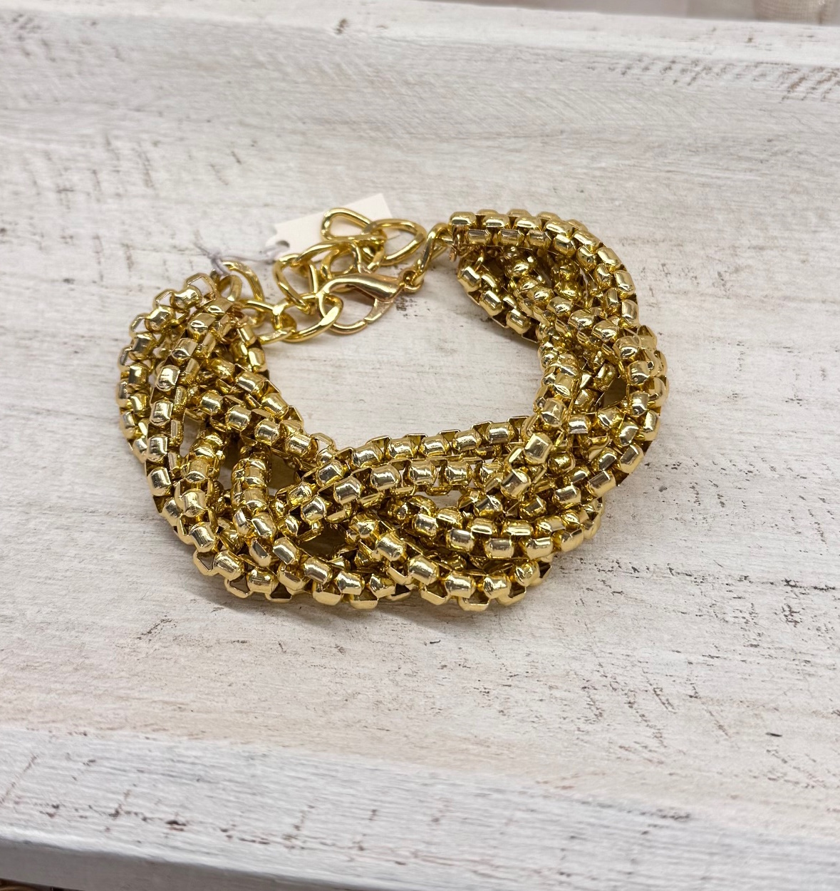 Pulsera dorada de aluminio realizada con 6 tiras entrelazadas.
