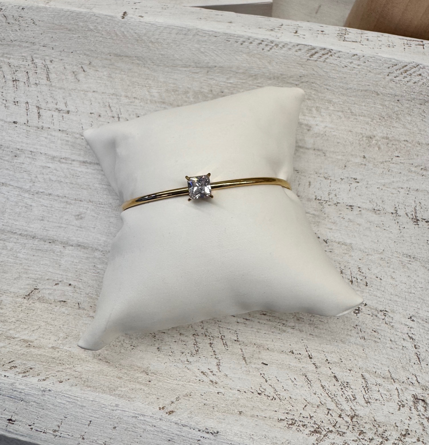 Pulsera de acero con circonita engarzada en el centro, Parte trasera abierta, lo que permite que se adapte a todas las medidas.
