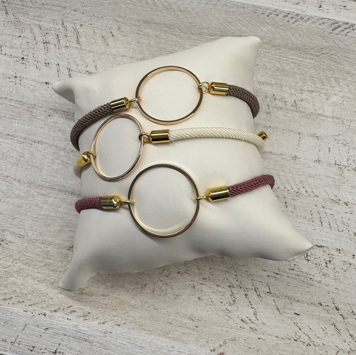 Pulsera realizada con cordón en diferentes colores y aro dorado de acero de 2,1cm