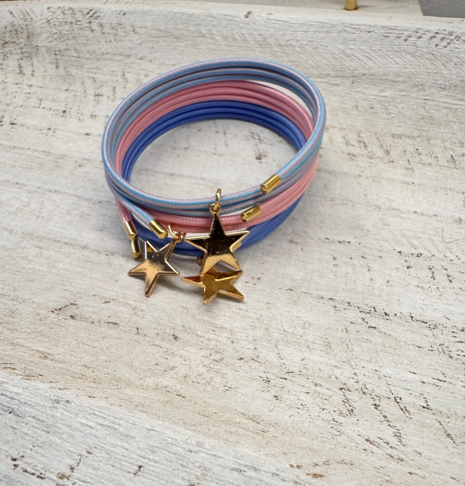 Pulsera con estrella dorada de acero montada en cordón redondo imantado. No necesita cierre, y si lo deseas puedes llevarla también de gargantilla.