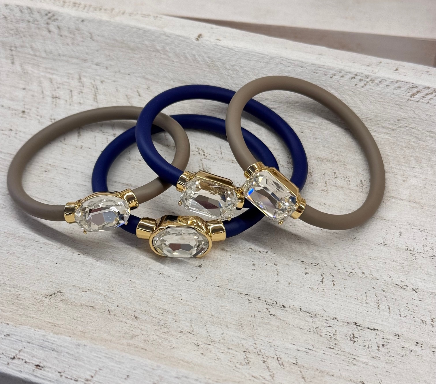 Pulsera con correa de caucho y circonita en forma ovalada y cuadrada. Talla única.