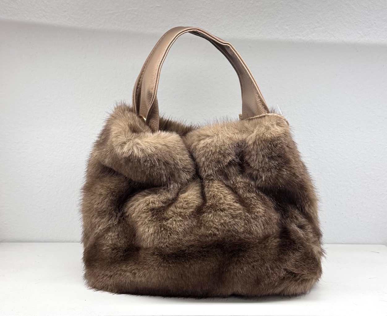 Bolso de pelo sintético en forma de saquito. Tacto muy suave. Asa y base de polipiel y cadena fina dorada.