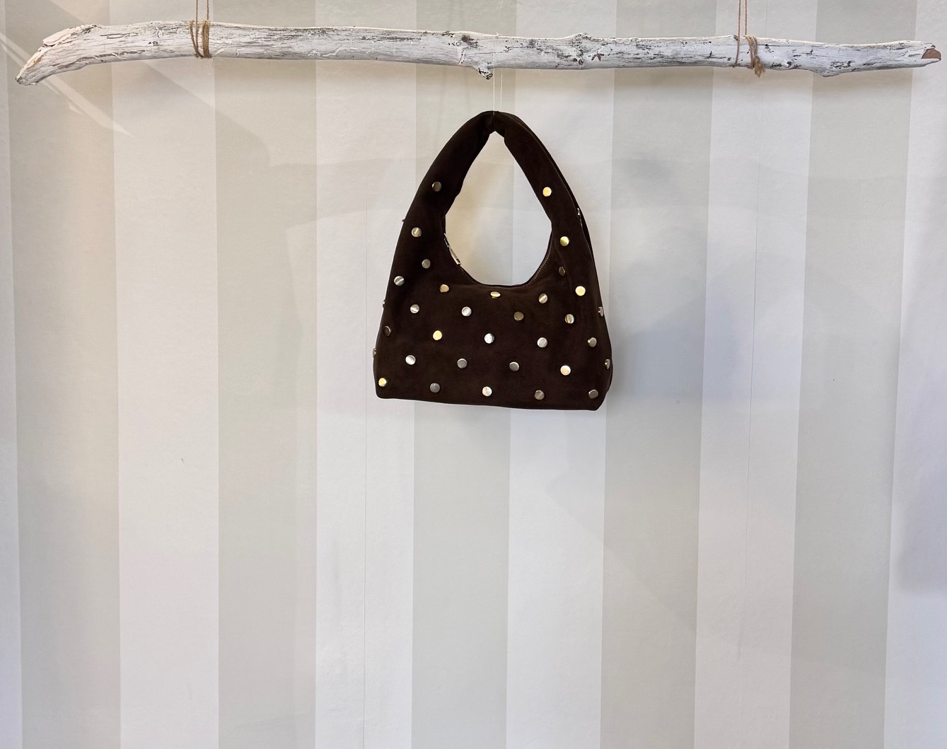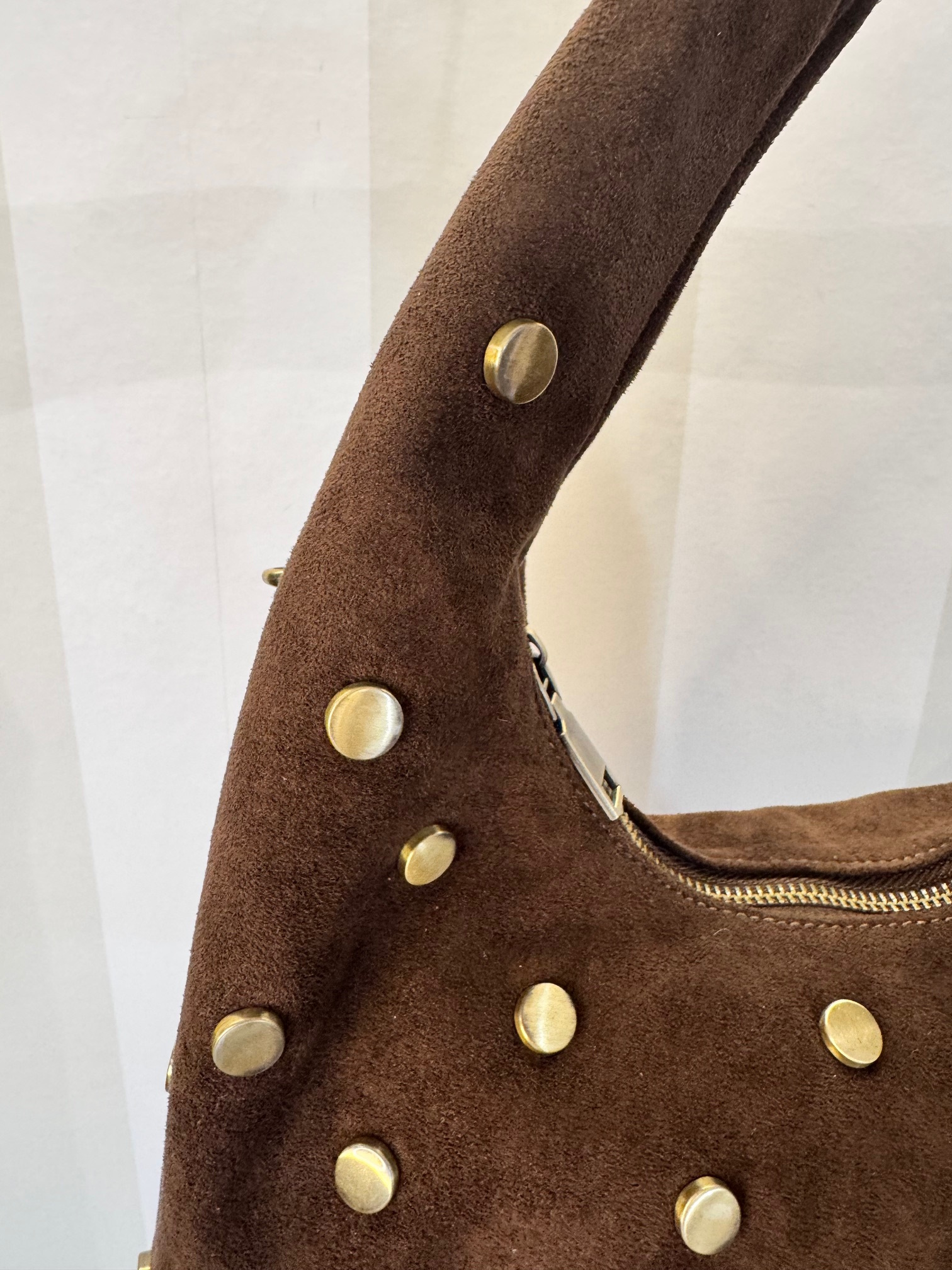 Bolso marrón de serraje con tachuelas doradas. Puedes llevarlo de mano o colgado con tira larga incluída.