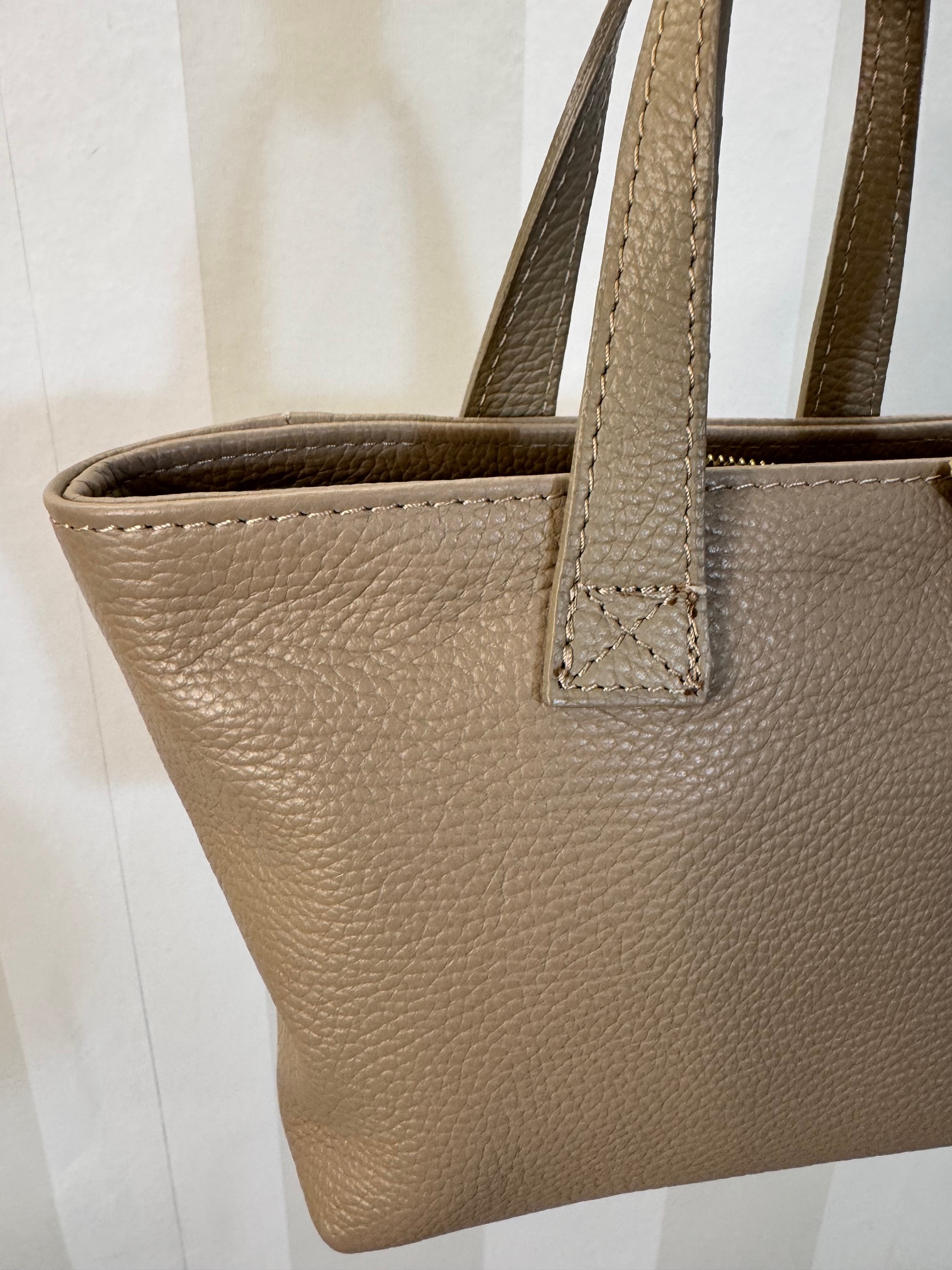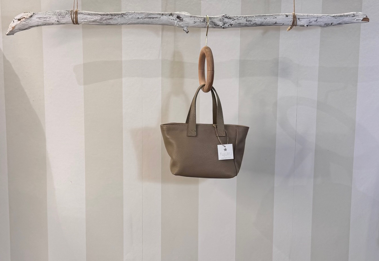 Bolso de polipiel pequeño. Asa corta de mano y tira larga de mano para llevar en bandolera. Bolsillo interior y en la parte trasera.