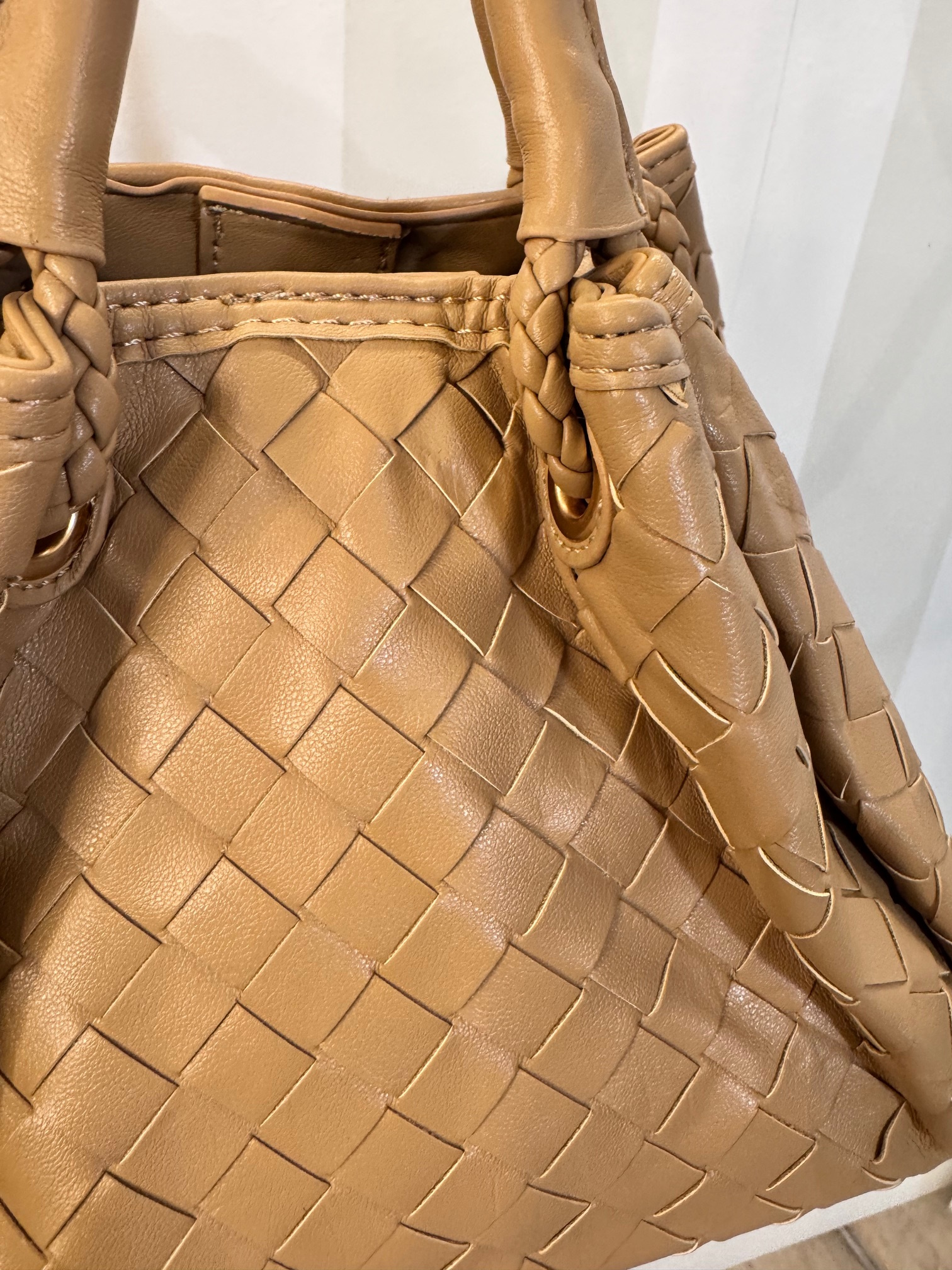 Bolso trenzado de polipiel con asa corta (puedes llevar a hombro) y tira larga para poder llevarlo de bandolera. Forro interior beige con bolsillo pequeño.