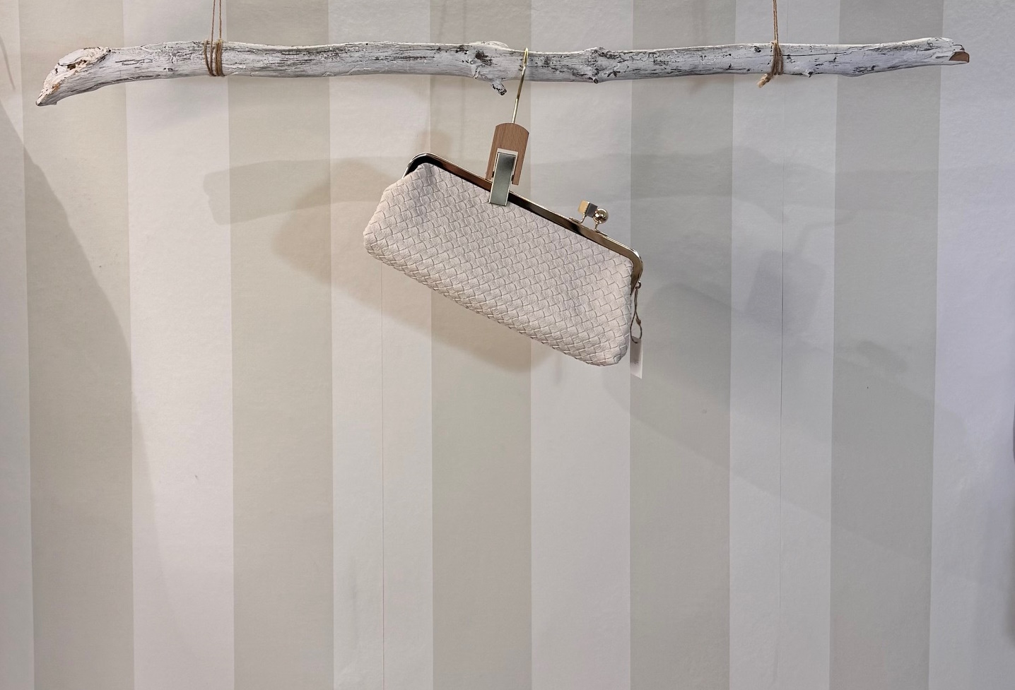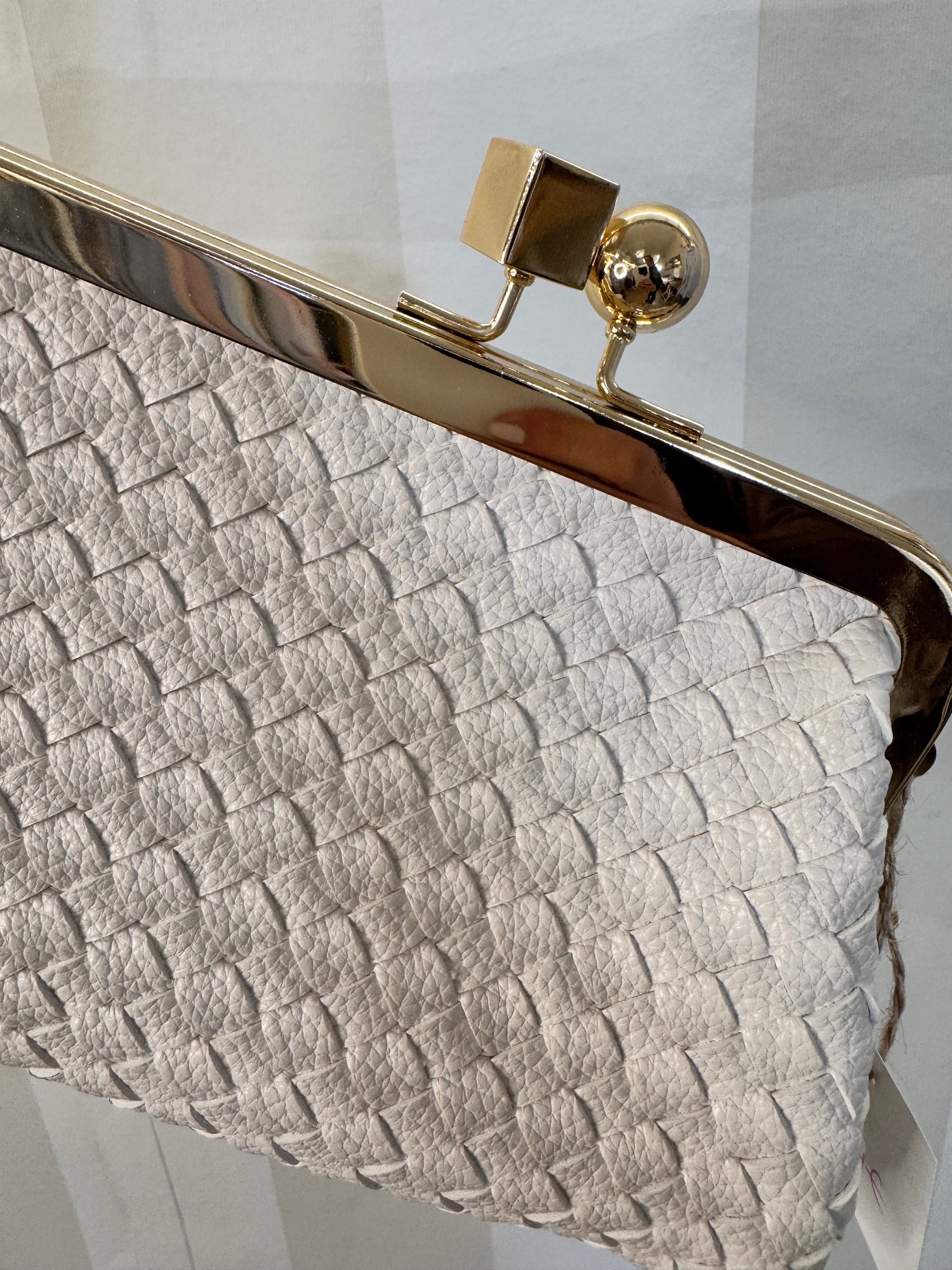 Bolso trenzado de polipiel con cierre clutch. Puedes llevarlo de mano o colgarlo con cadena dorada que lleva en el interior. Forro interior rosa palo con mini bolsillo.