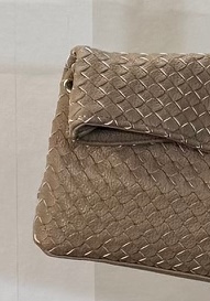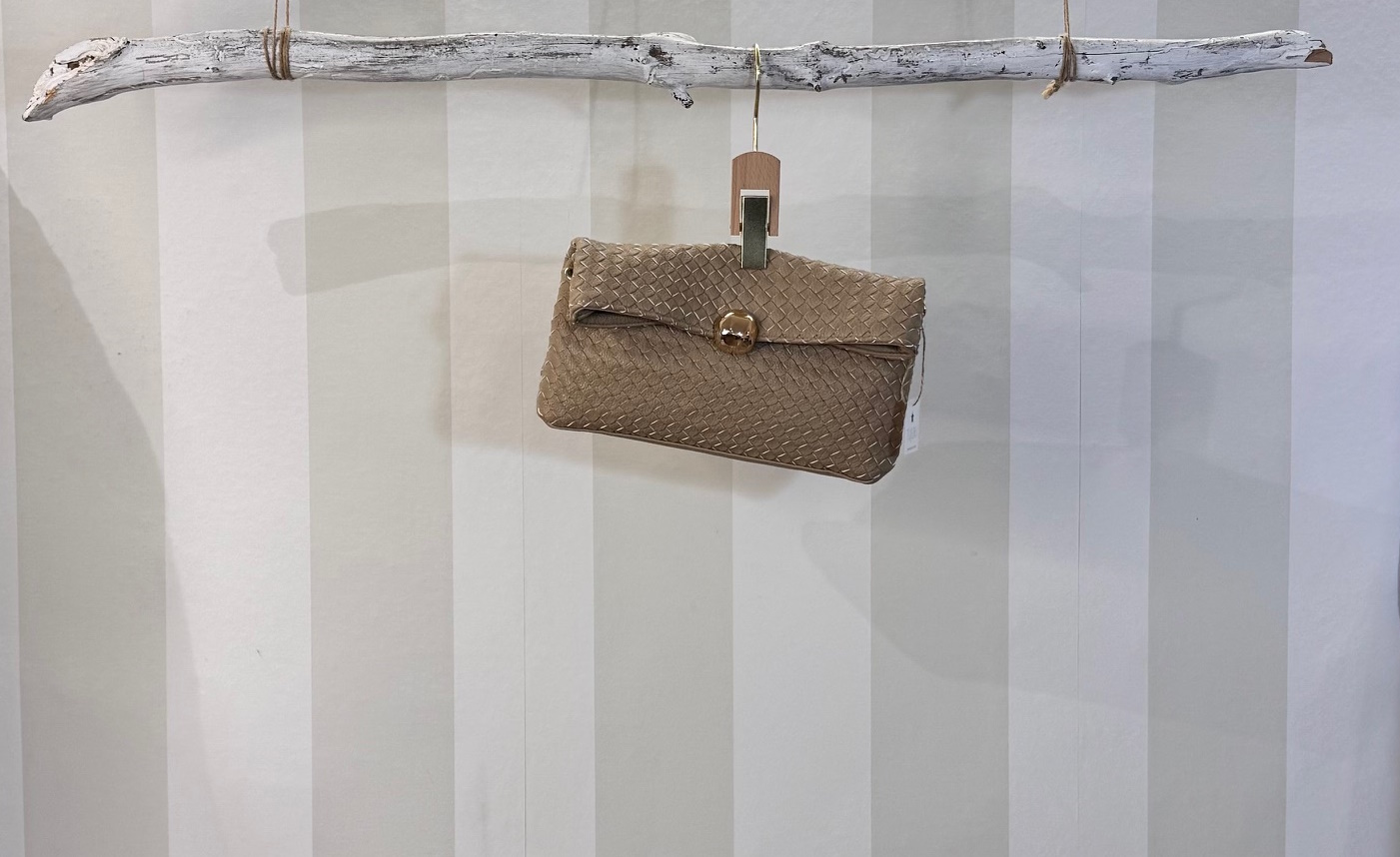 Bolso trenzado de polipiel que puedes llevarde mano o colgado con cadena dorada. Solapa delantera doblada. Forro interior rosa palo y dos bolsillos.