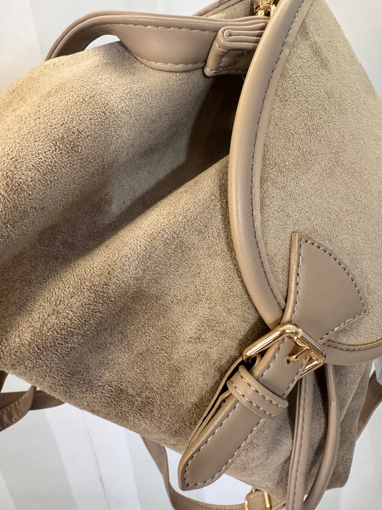 Bolso antelina con solapa y asa larga.