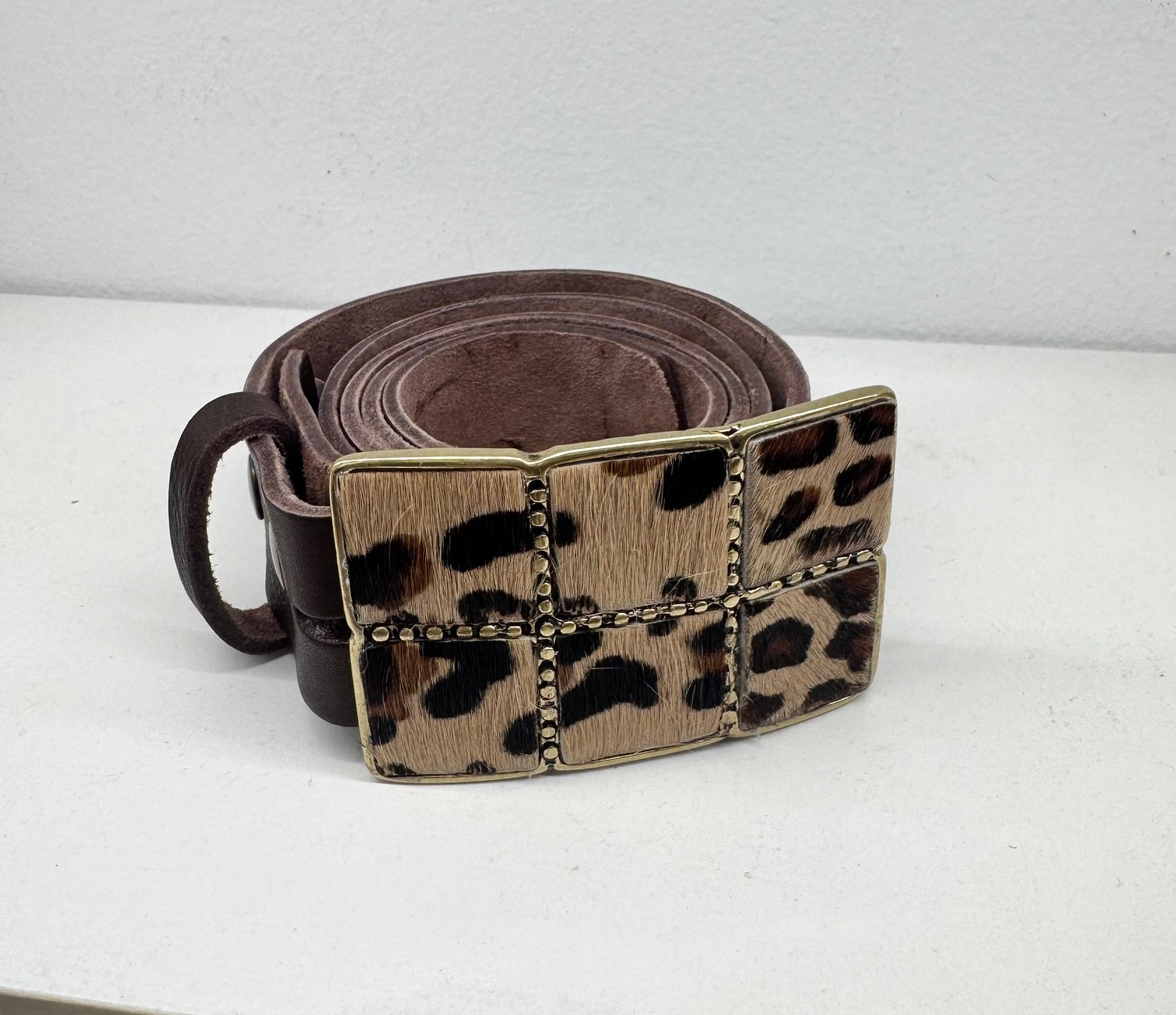 Cinturón de piel con hebilla dorada de cuadros y pelito natural en animal print.