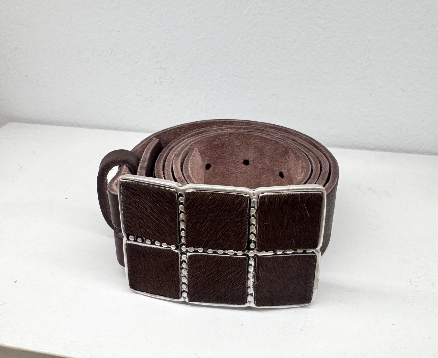 Cinturón marrón de piel con hebilla cuadriculada plateada y pelito marrón oscuro.