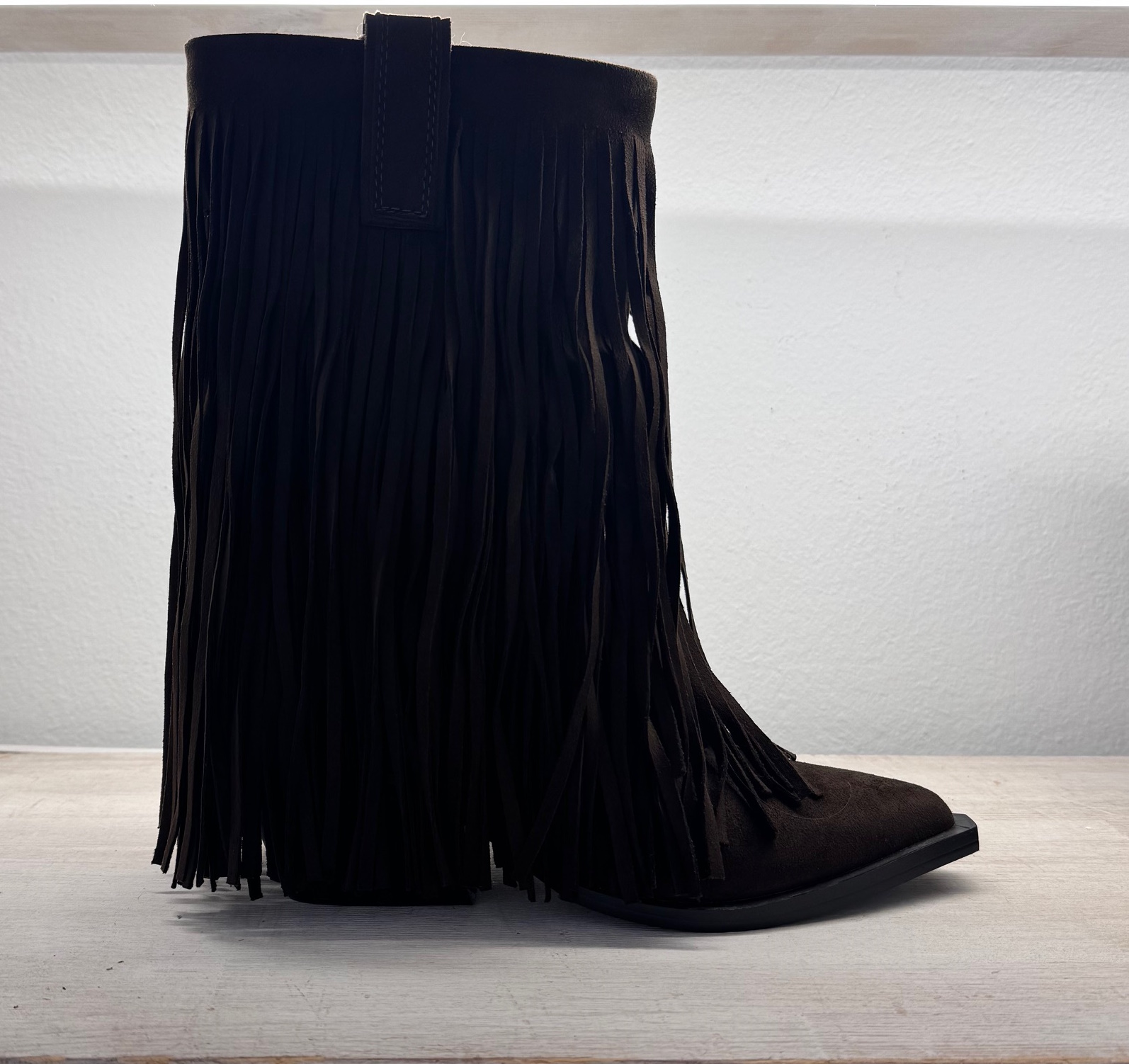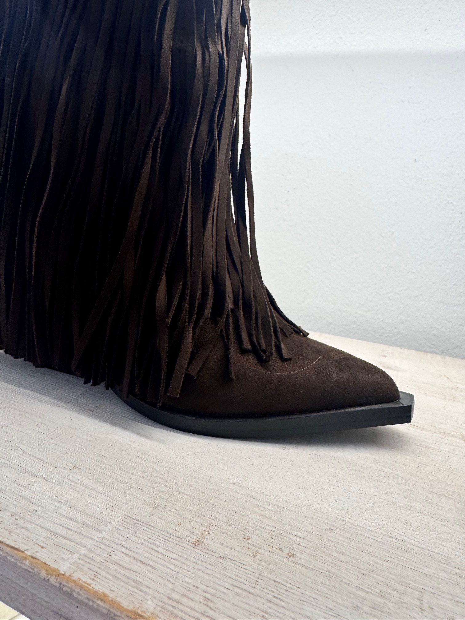 Bota estilo campera de caña media con flecos largos. Color marrón chocolate.