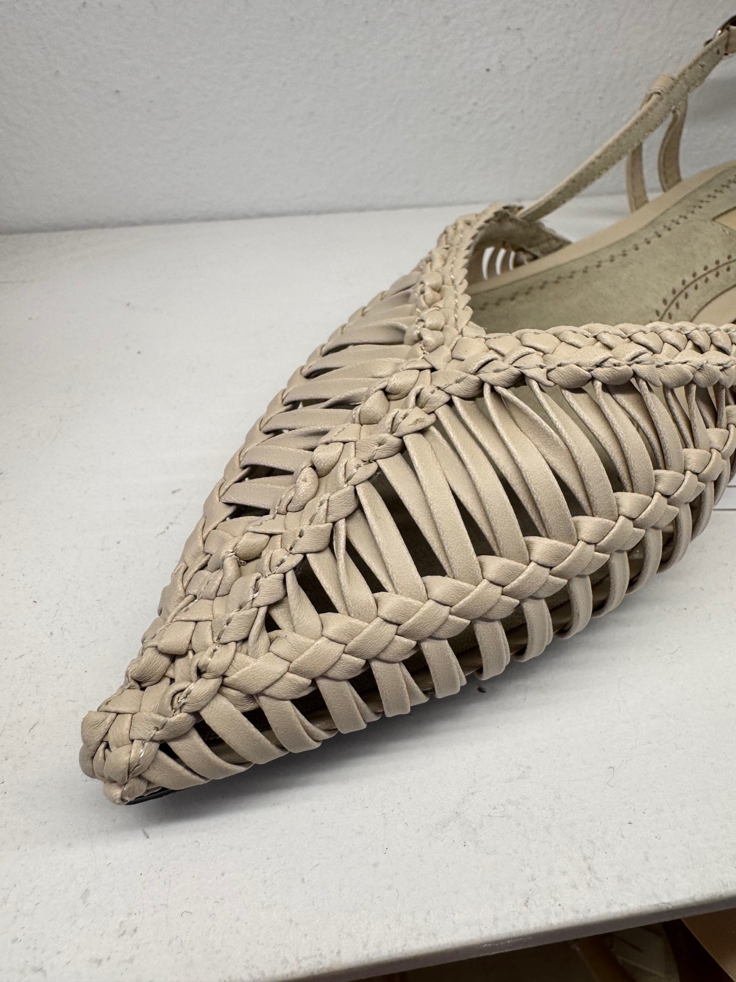 Sandalia plana trenzada abierta en talón con tira graduable.