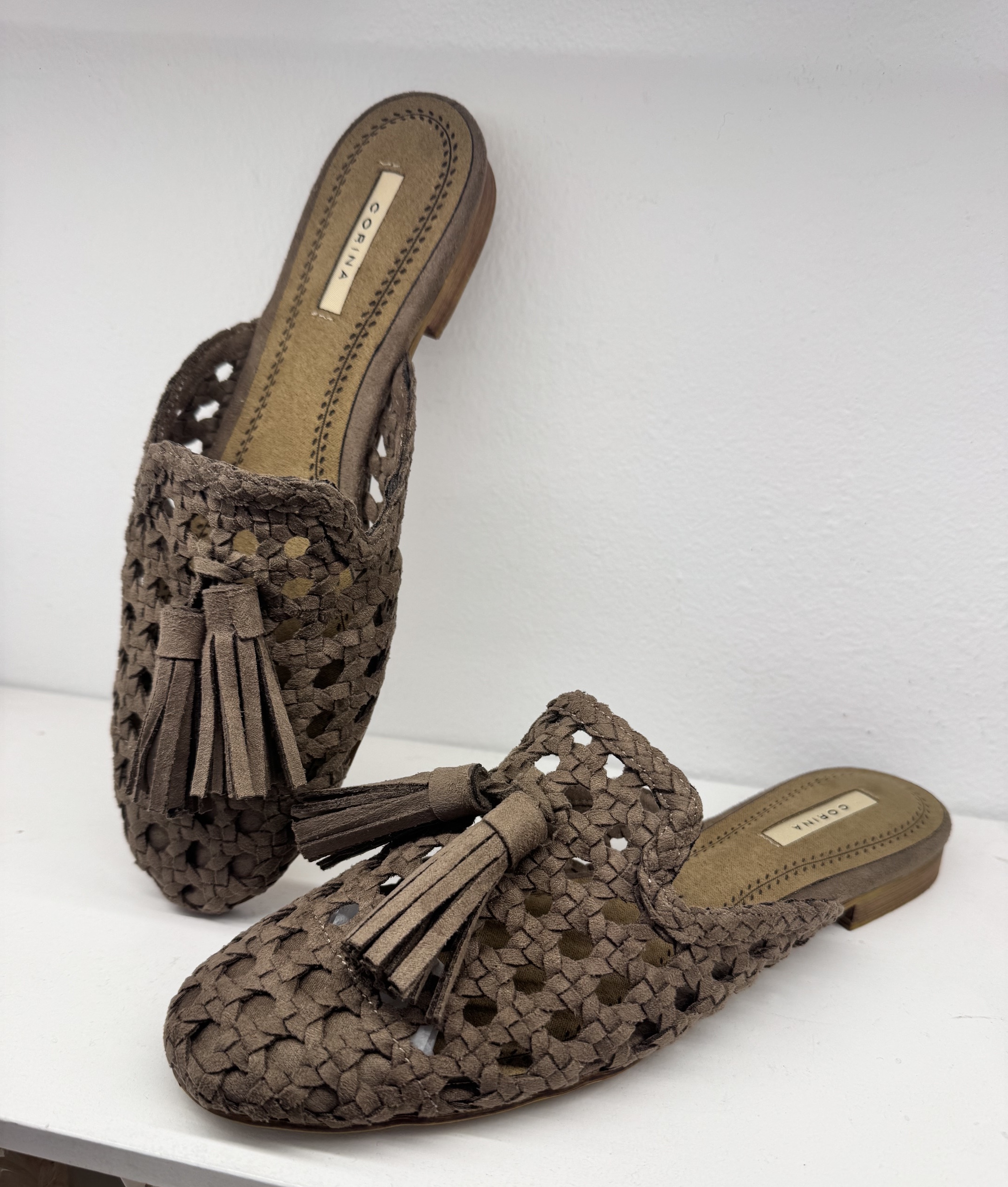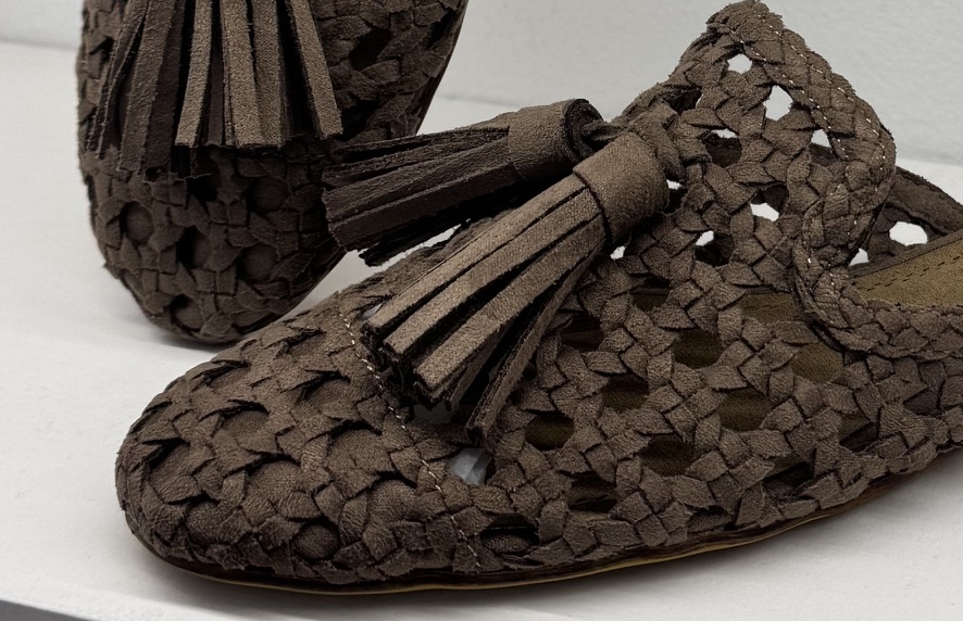 Mule en color taupe con borlas. Talón descubierto, pero es cómodo.