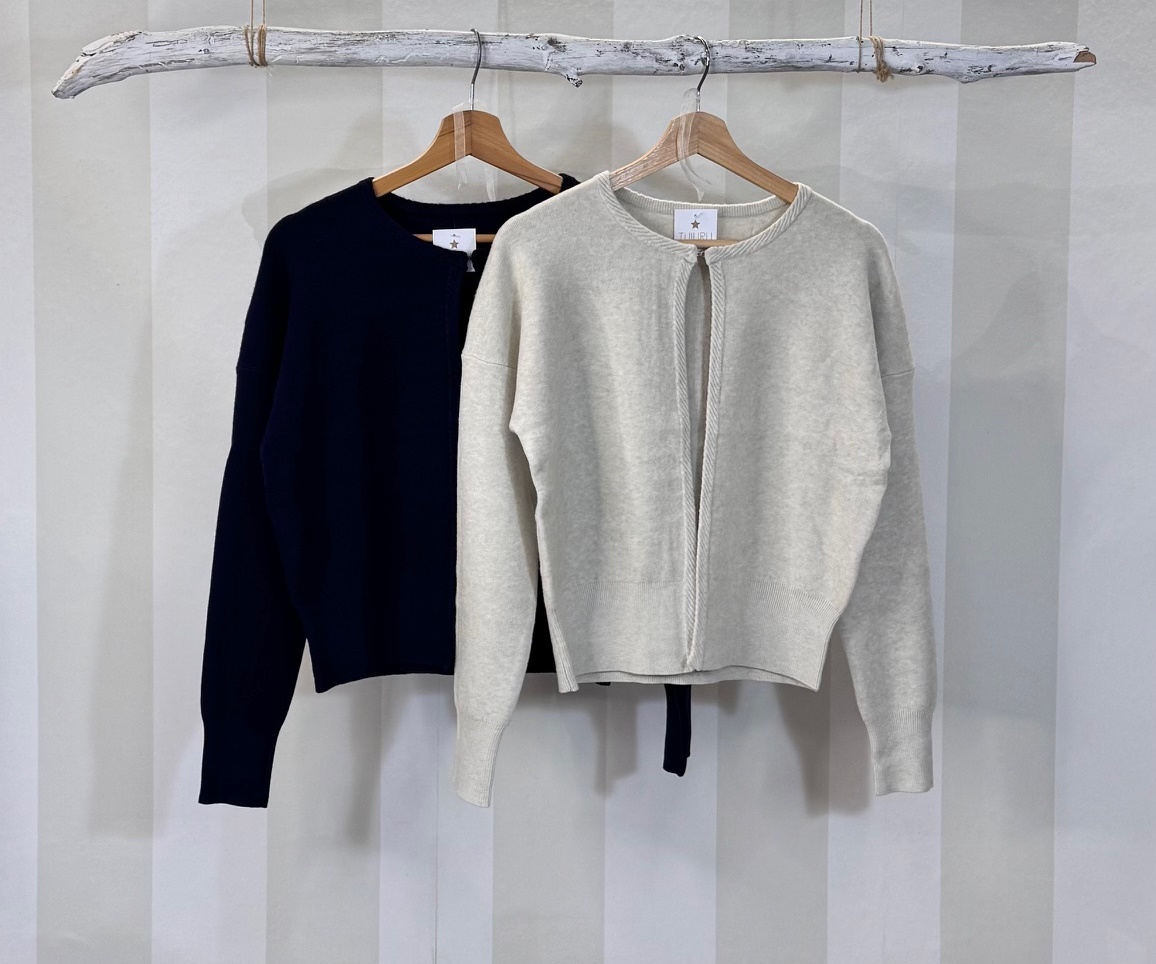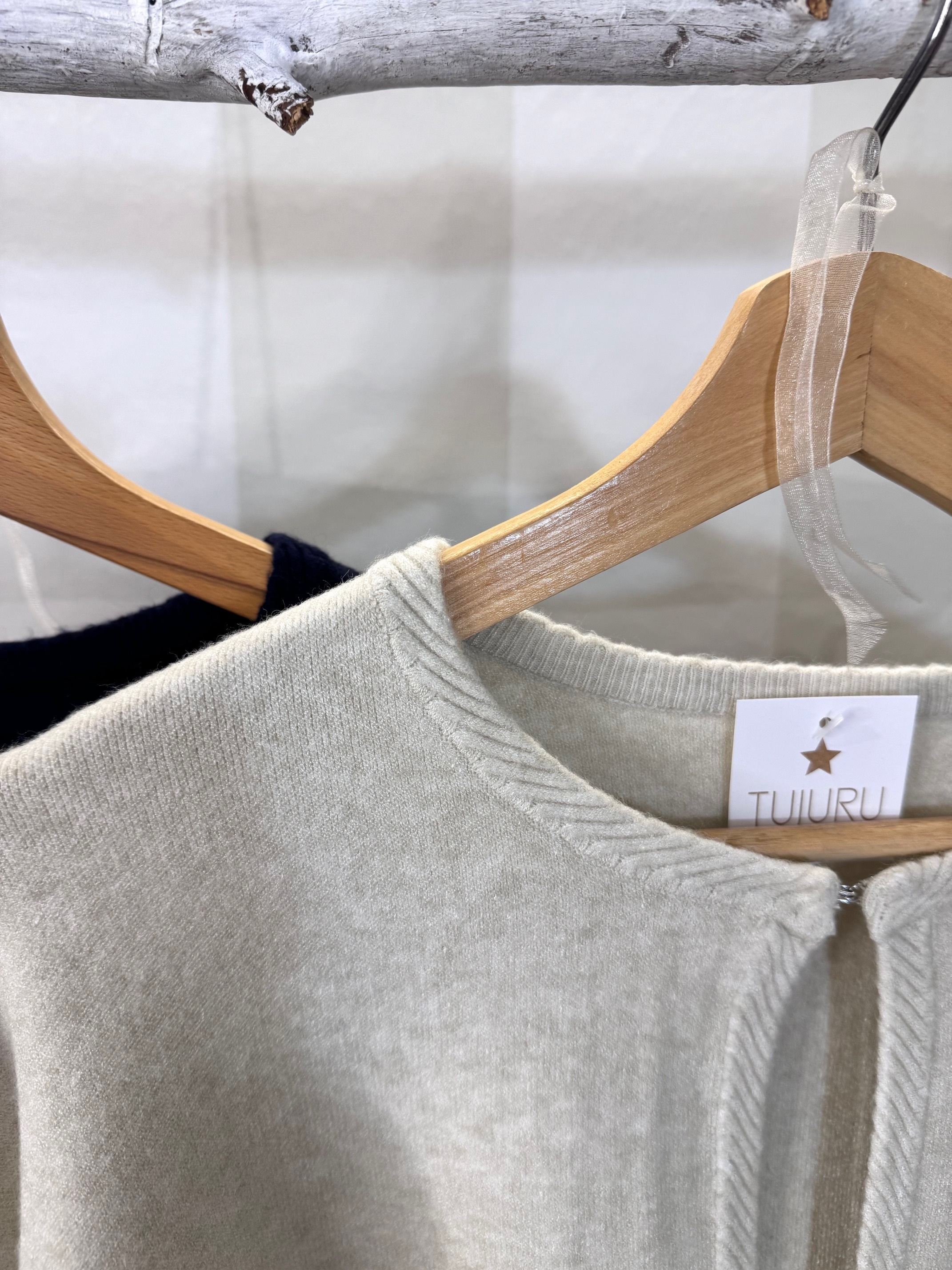 Chaqueta de punto con ribete en el cuello. Cierra con gancho en la parte superior. Talla única.