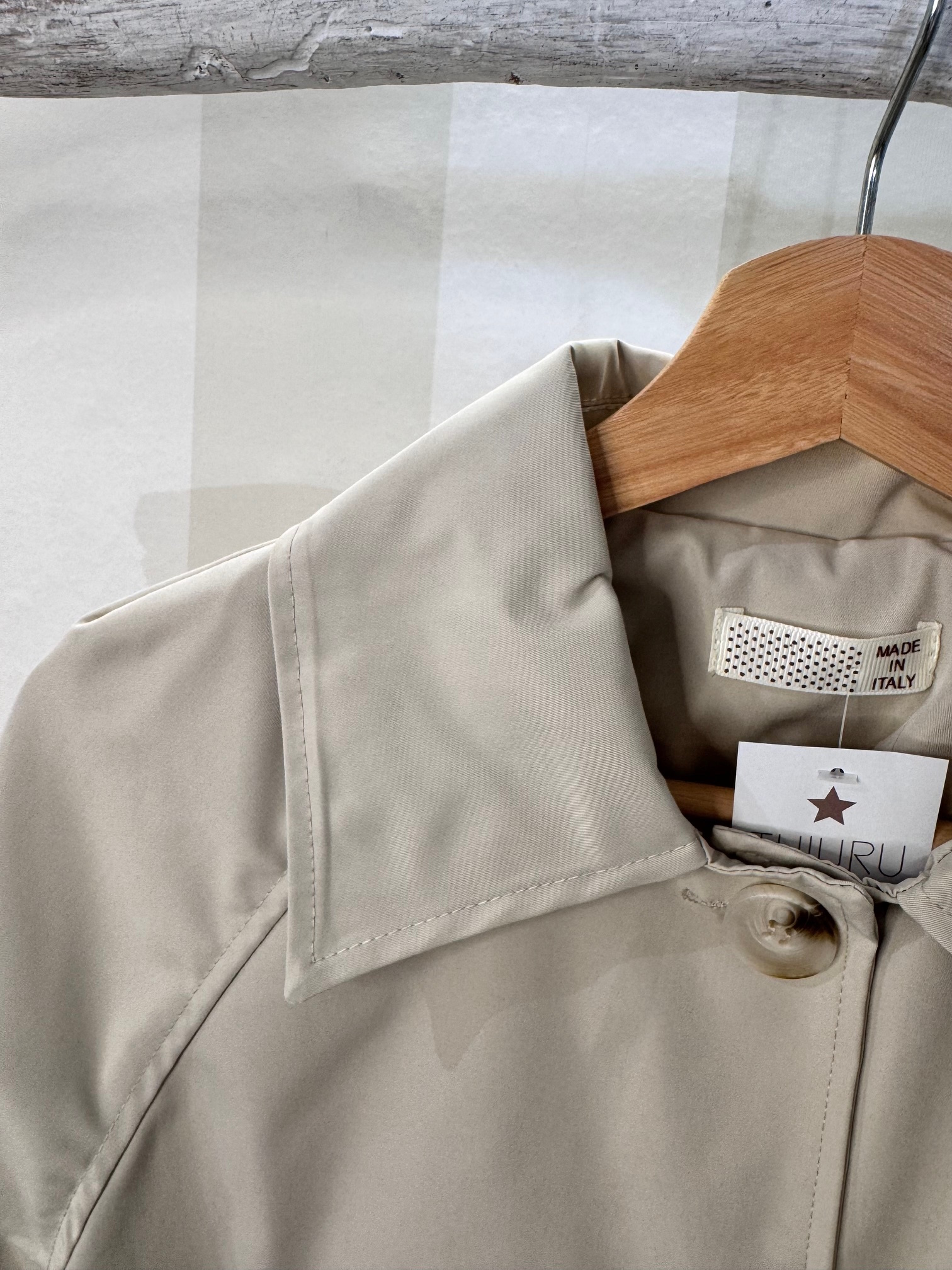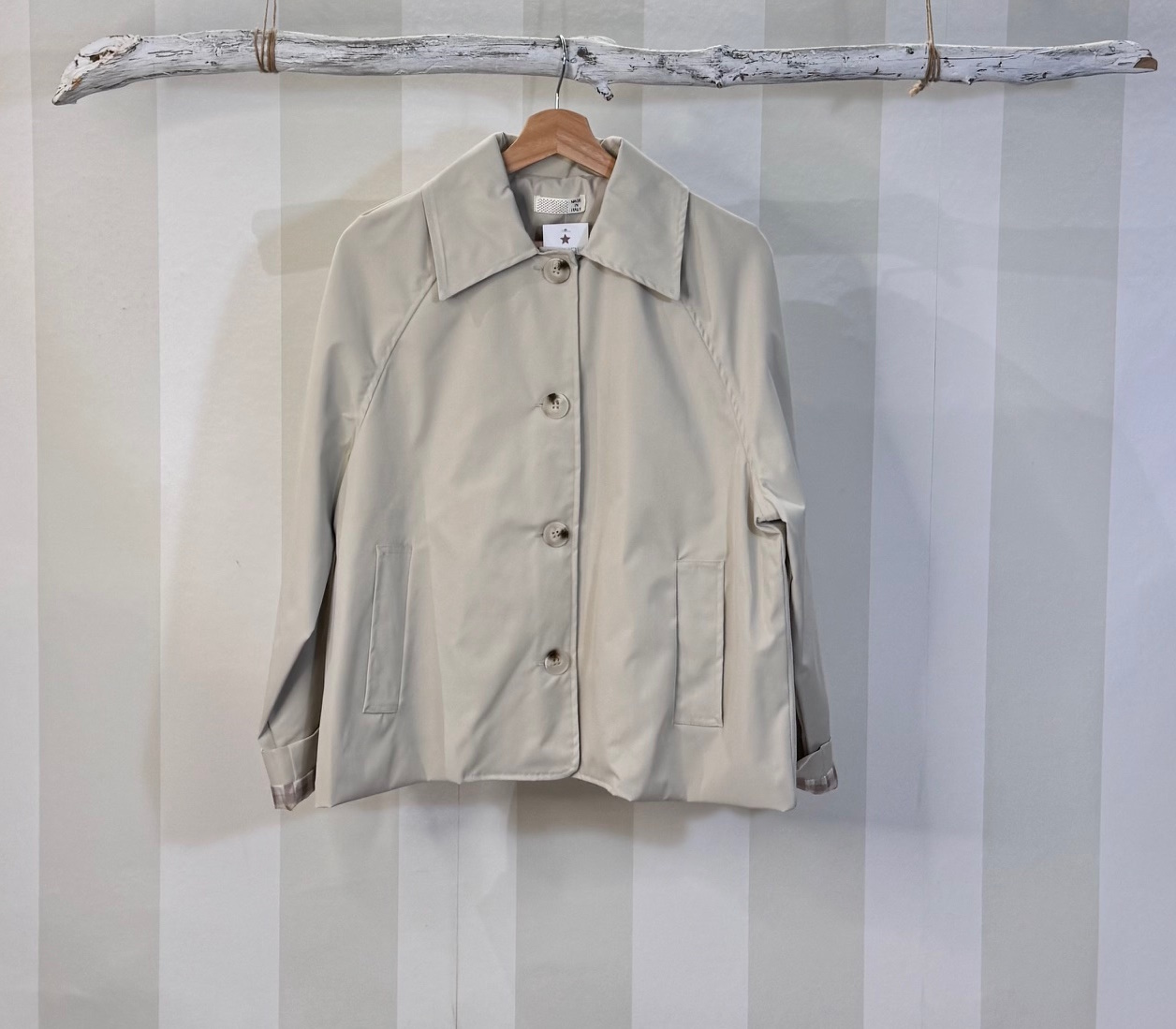 Chaqueta fina estilo gabardina con solapa y bolsillos. Talla única. Ligera forma evasé.