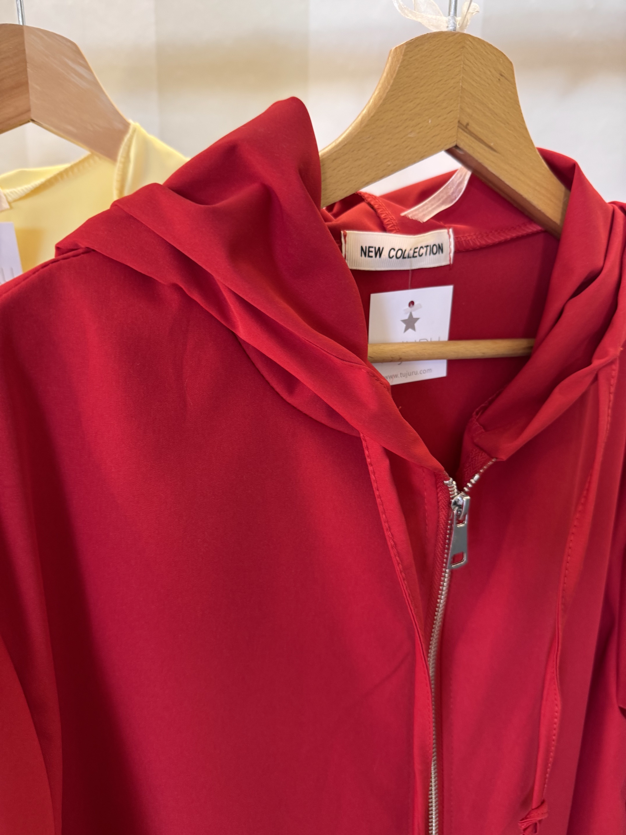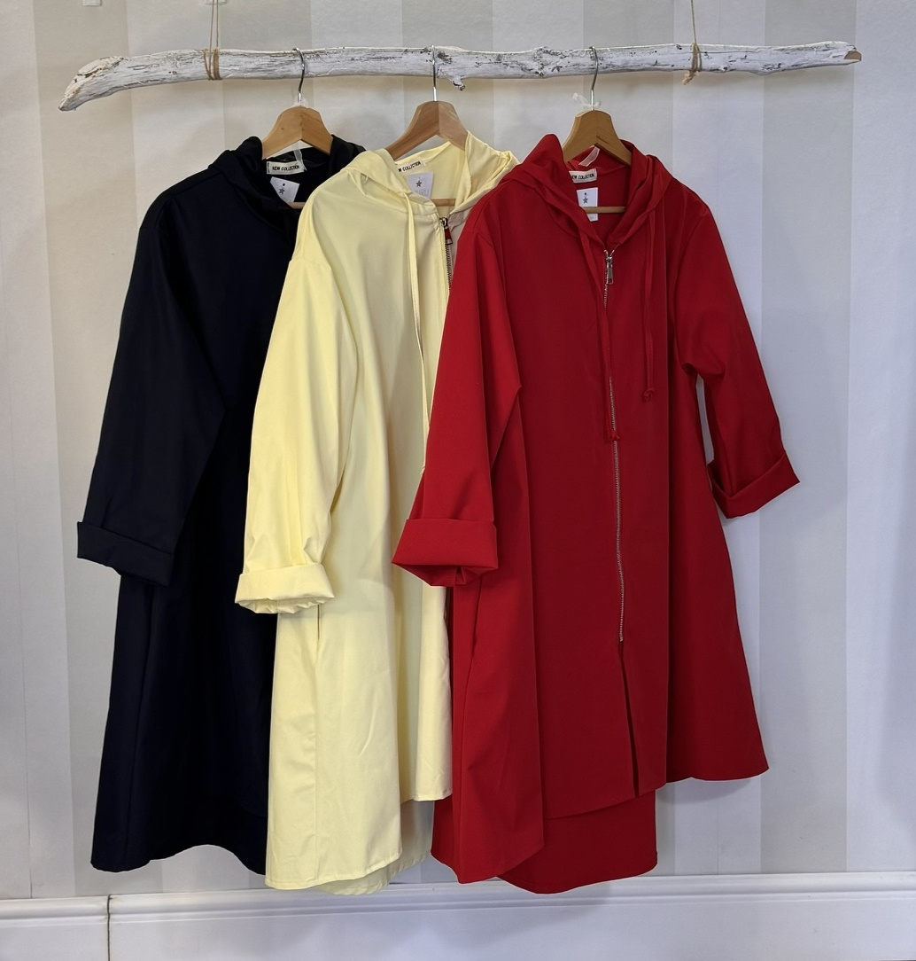 Chaqueta estilo gabardina con forma evasé e irregular. M´s larga en la parte posterior.