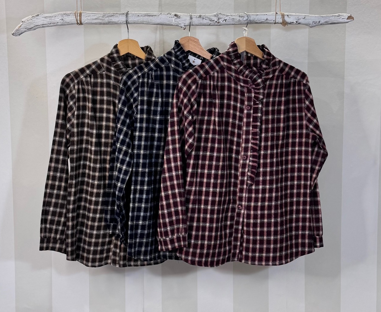 Camisa de cuadrios con pequeñas chorrera en la aprte delanatera. Tejido estilo franela.