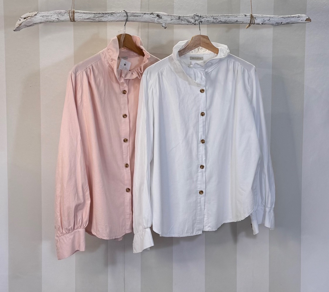 Camisa de micro pana no muy gruesa. Cuello rizado y subido. Talla única, no es estrecha.