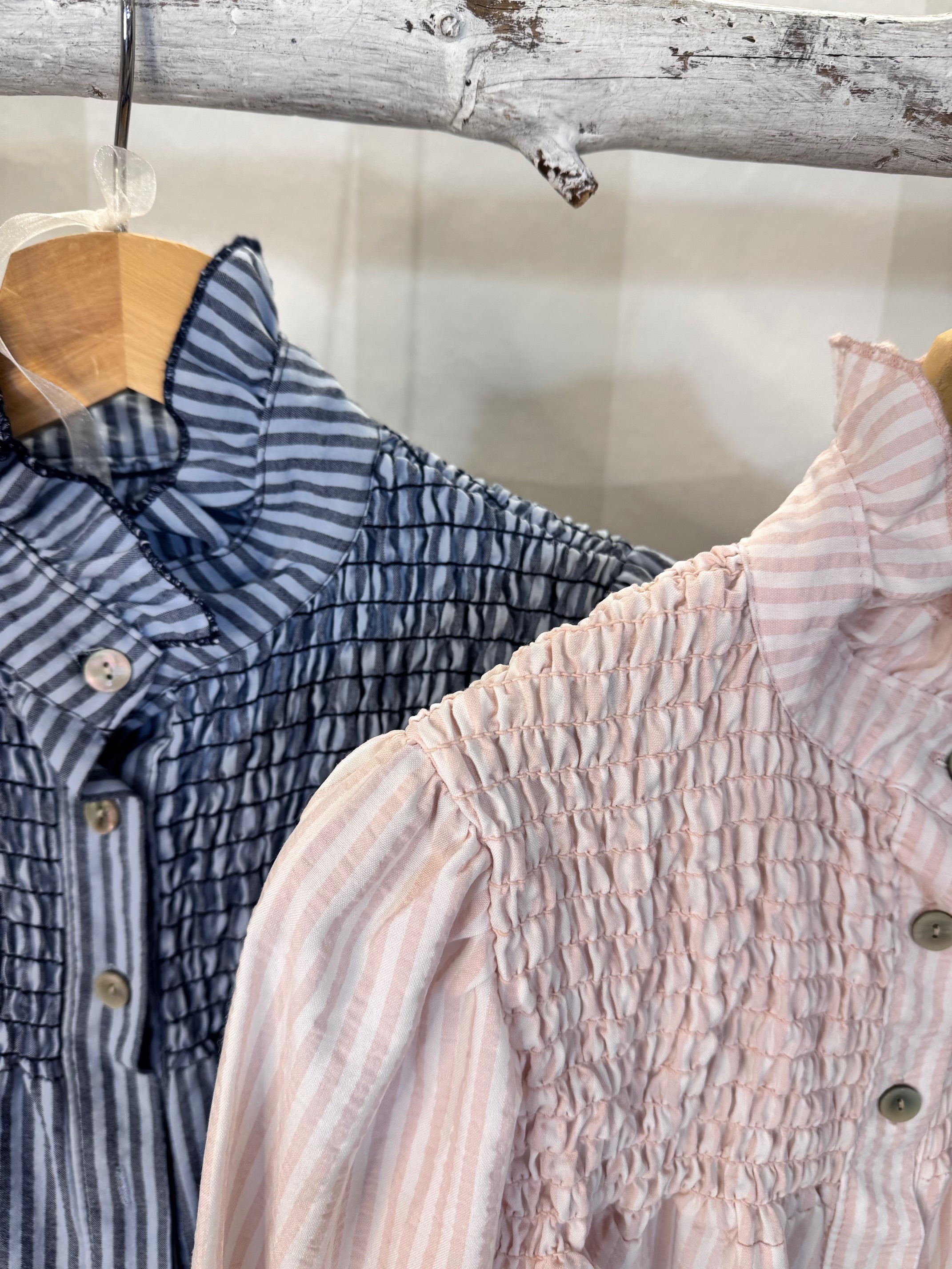 Camisa de rallas con pecho fruncido. Ligera forma evasé. Talla única.