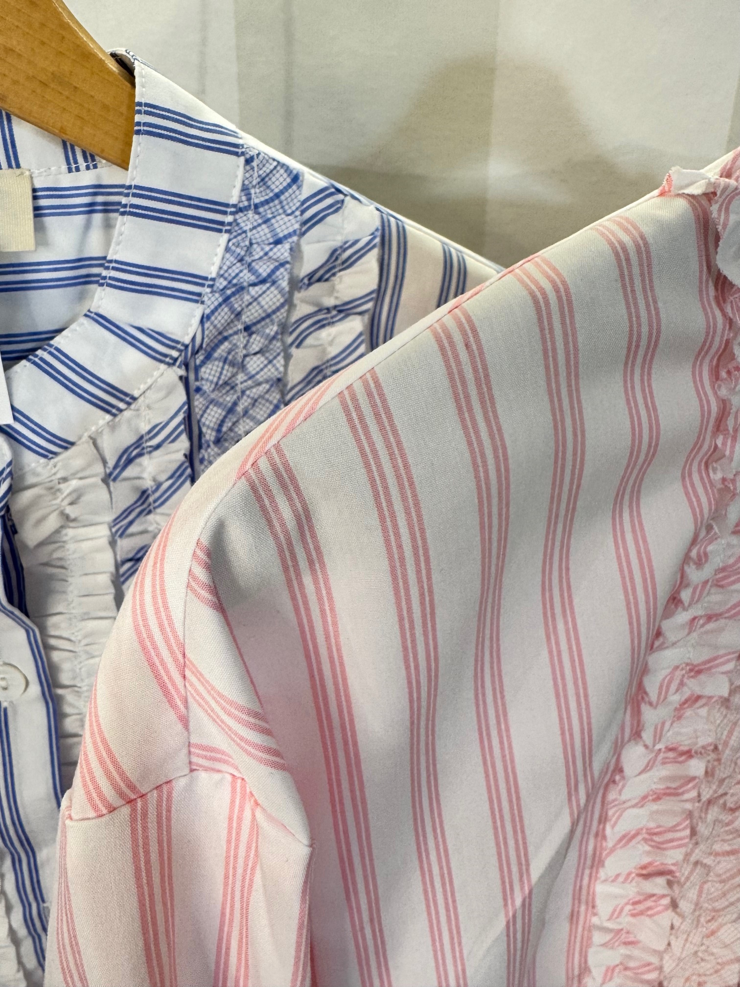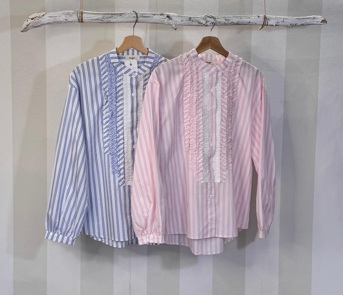 Camisa de popelín con rayas. Cuello mao con parte delantera con mini chorreras. Tacto muy suave.