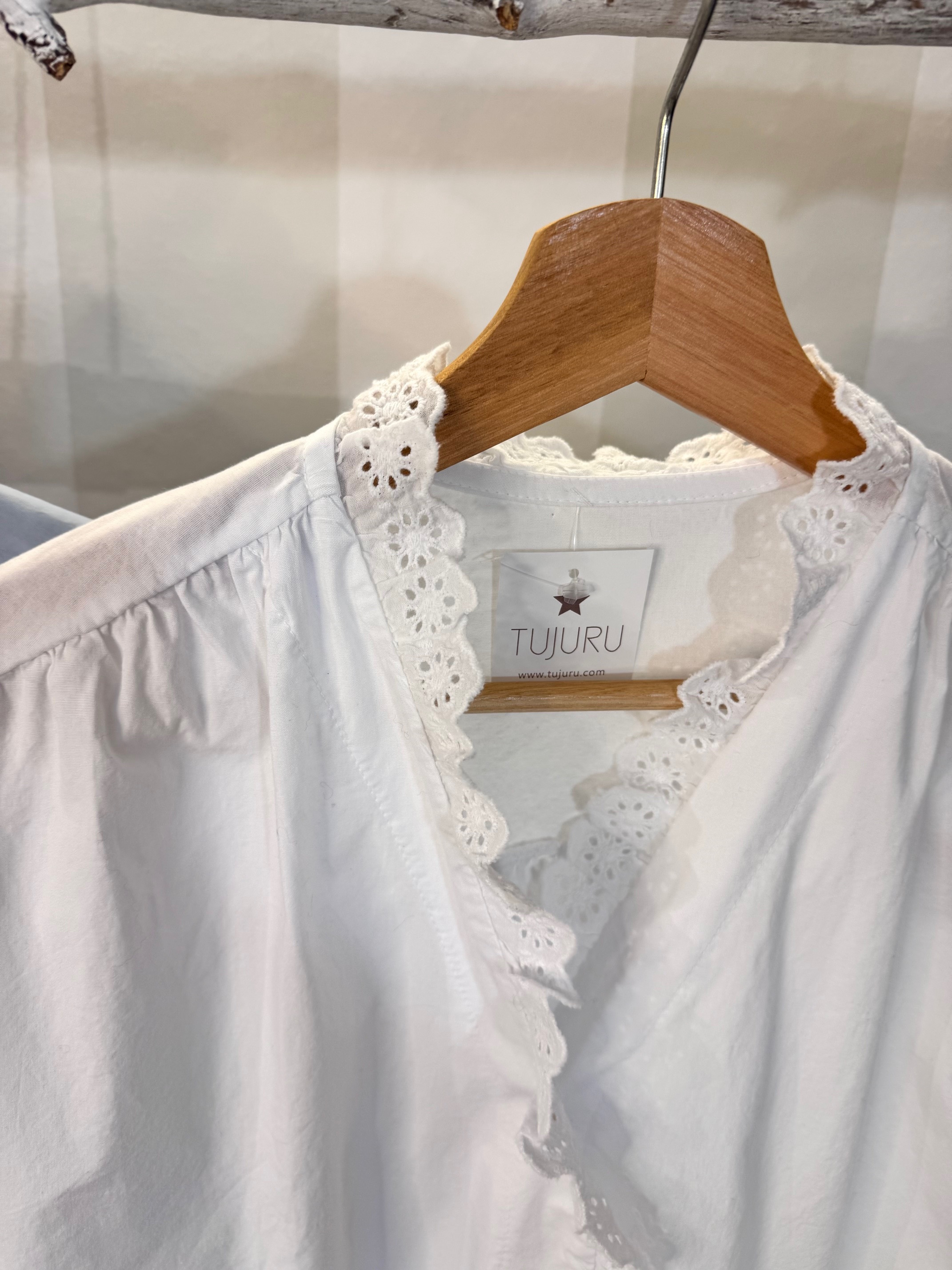 Camisa de algodón con escote pico y puntlla. Talla única.