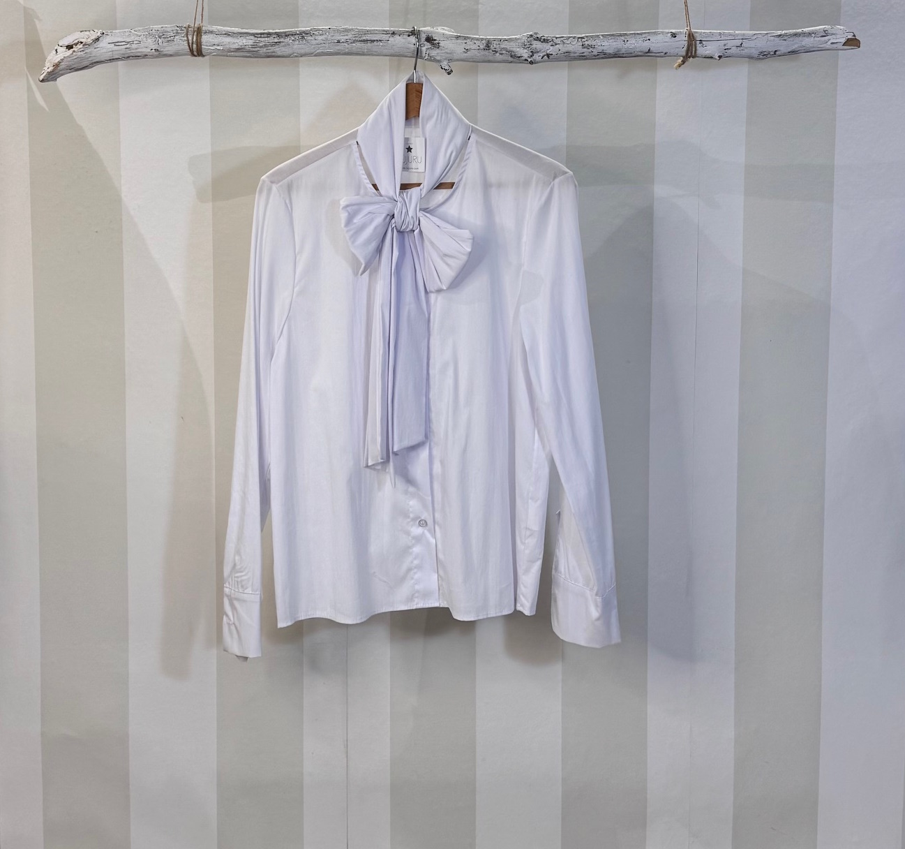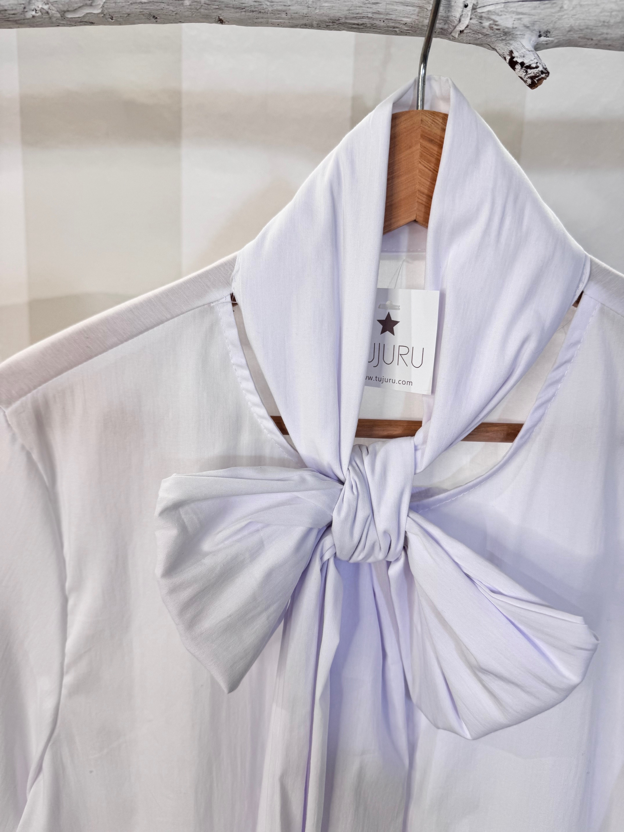 Camisa blanca de popelín sin solapa y con lazo. Tacto mus suave. Talla única.