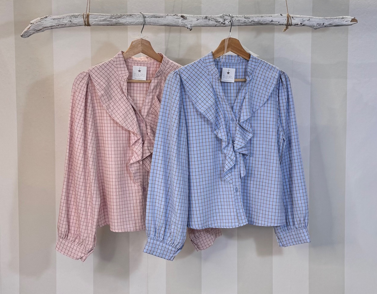 Camisa de cuadros con escote pico y volante con chorrera en el pecho: Talla única.