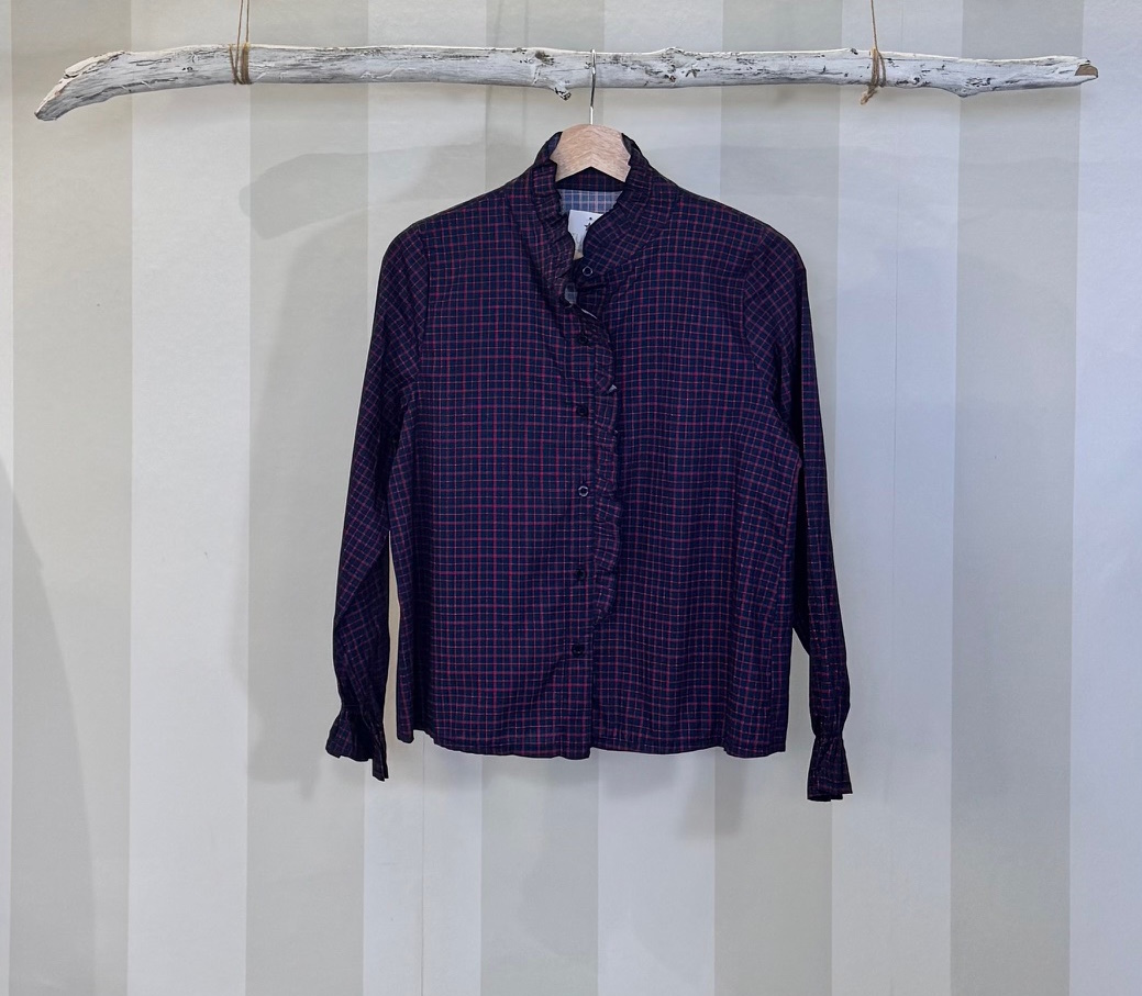 Camisa de cuadros combinando rojo y azul marino. Cuello rizado con pequeña chorrera delantera.