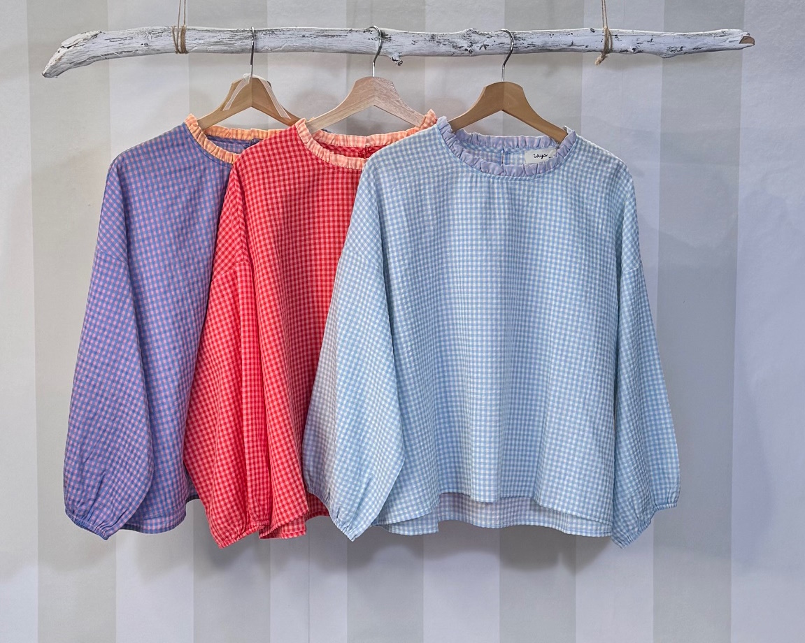 Camisa de cuadro vichy con cuello rizado en otro color. Talla única completa.