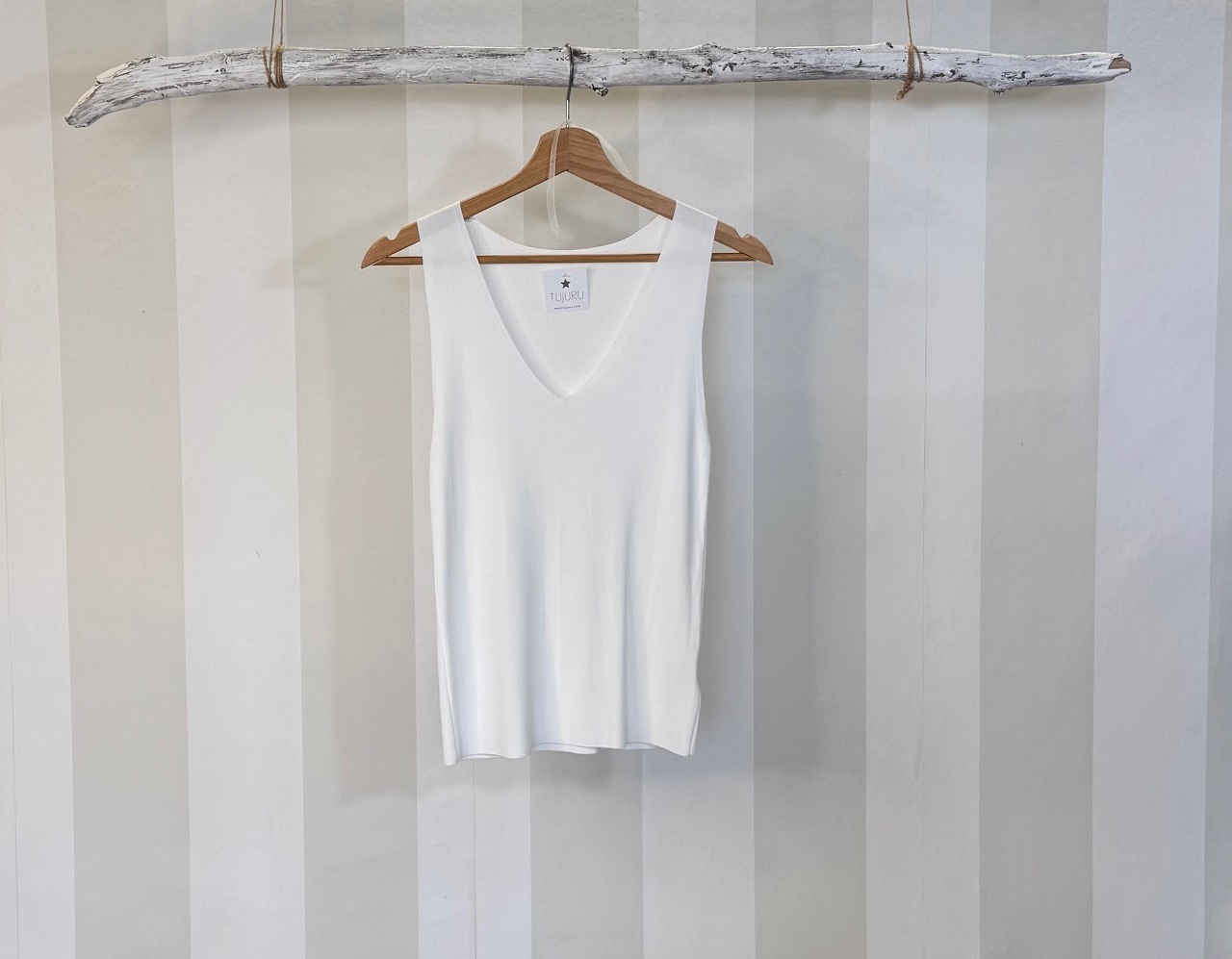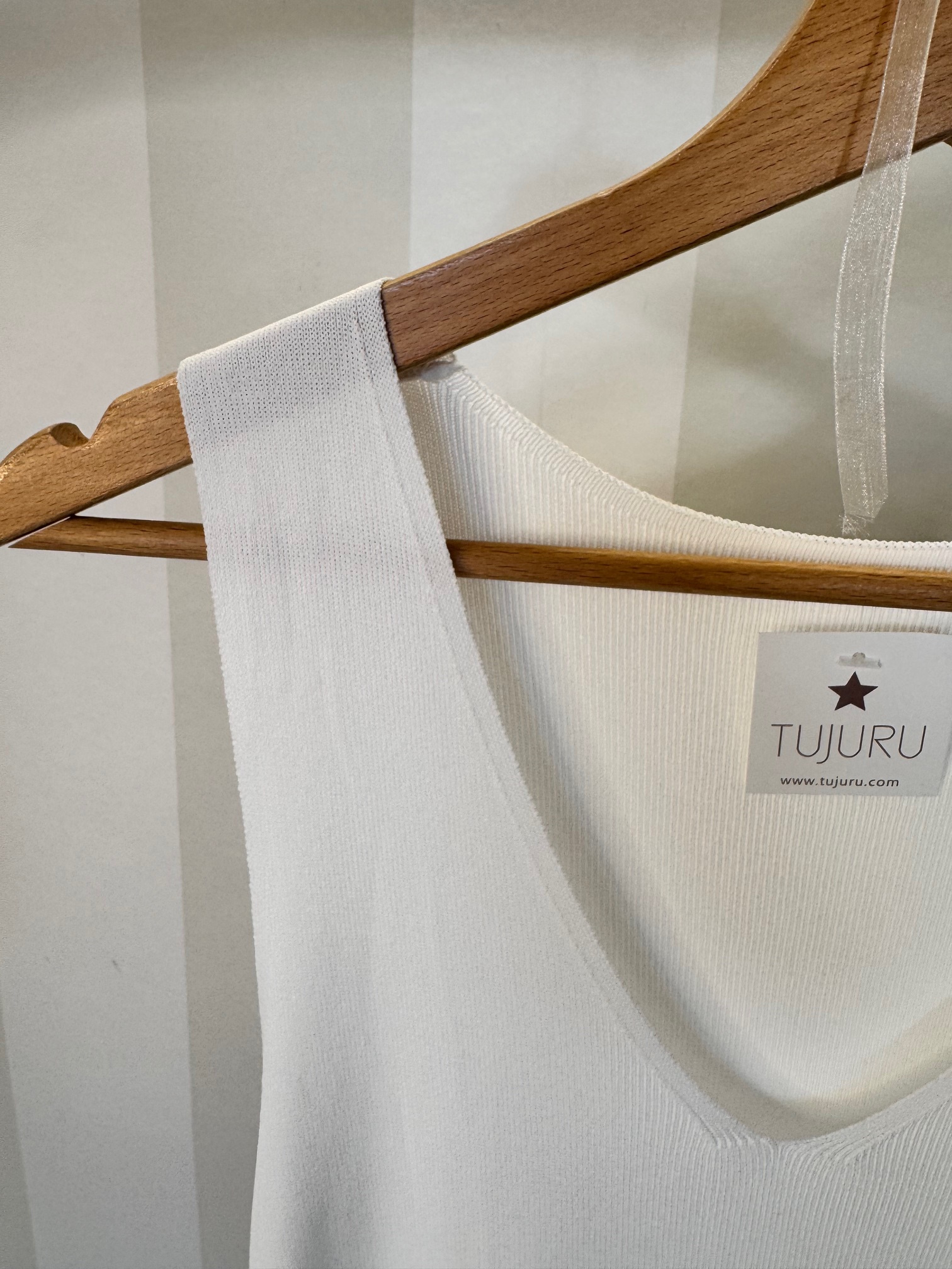 Top básico de punto frío con escote pico y tirante ancho. Talla única, modelo que queda ajusatdo.