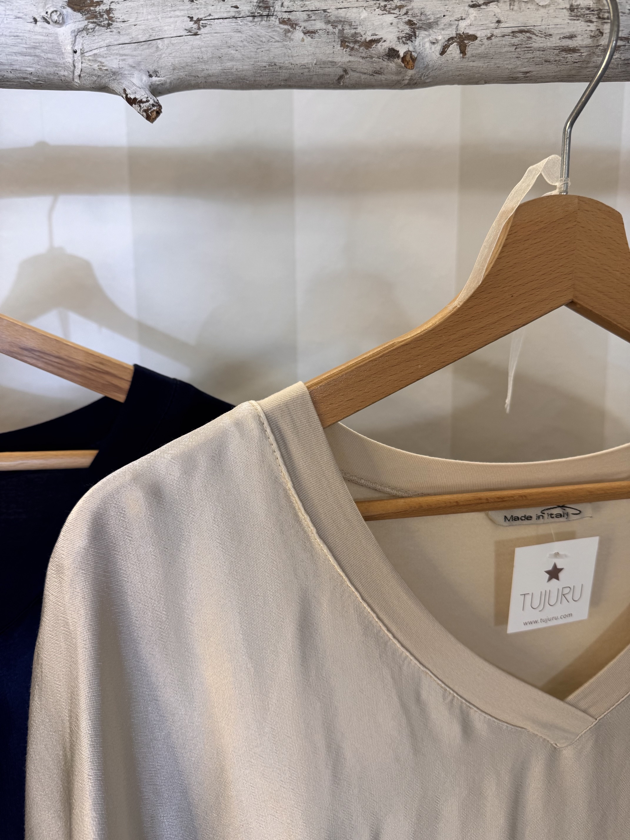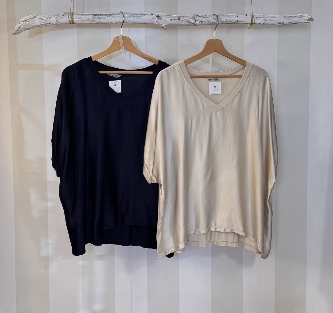 Maxi top satinado por la parte delantera y viscosa en la trasera. Ecote pico. Talla única completa.