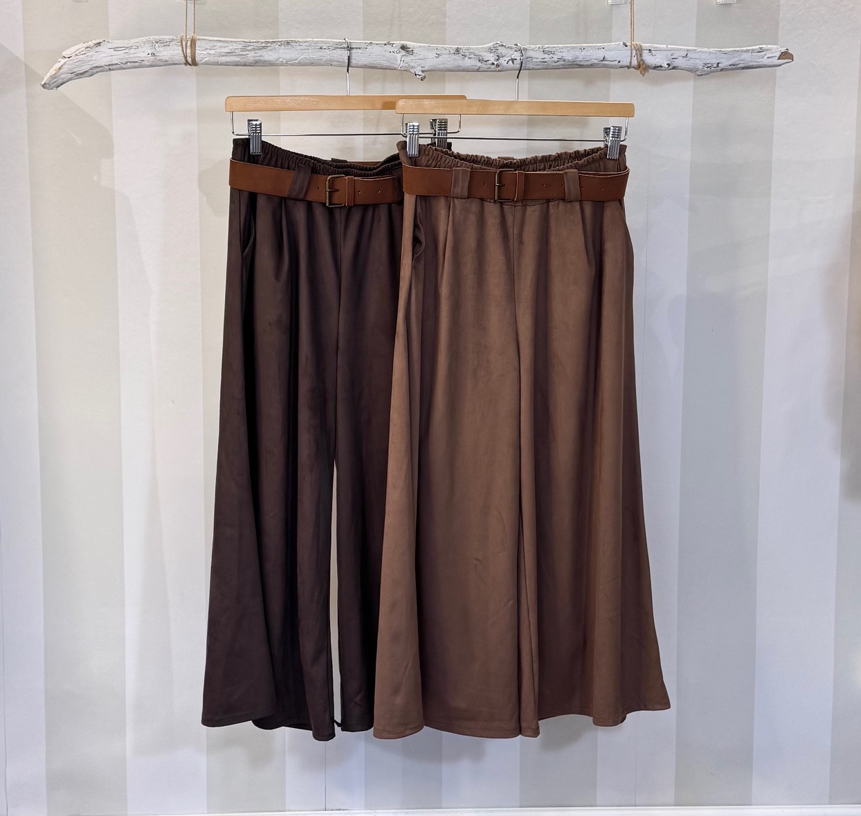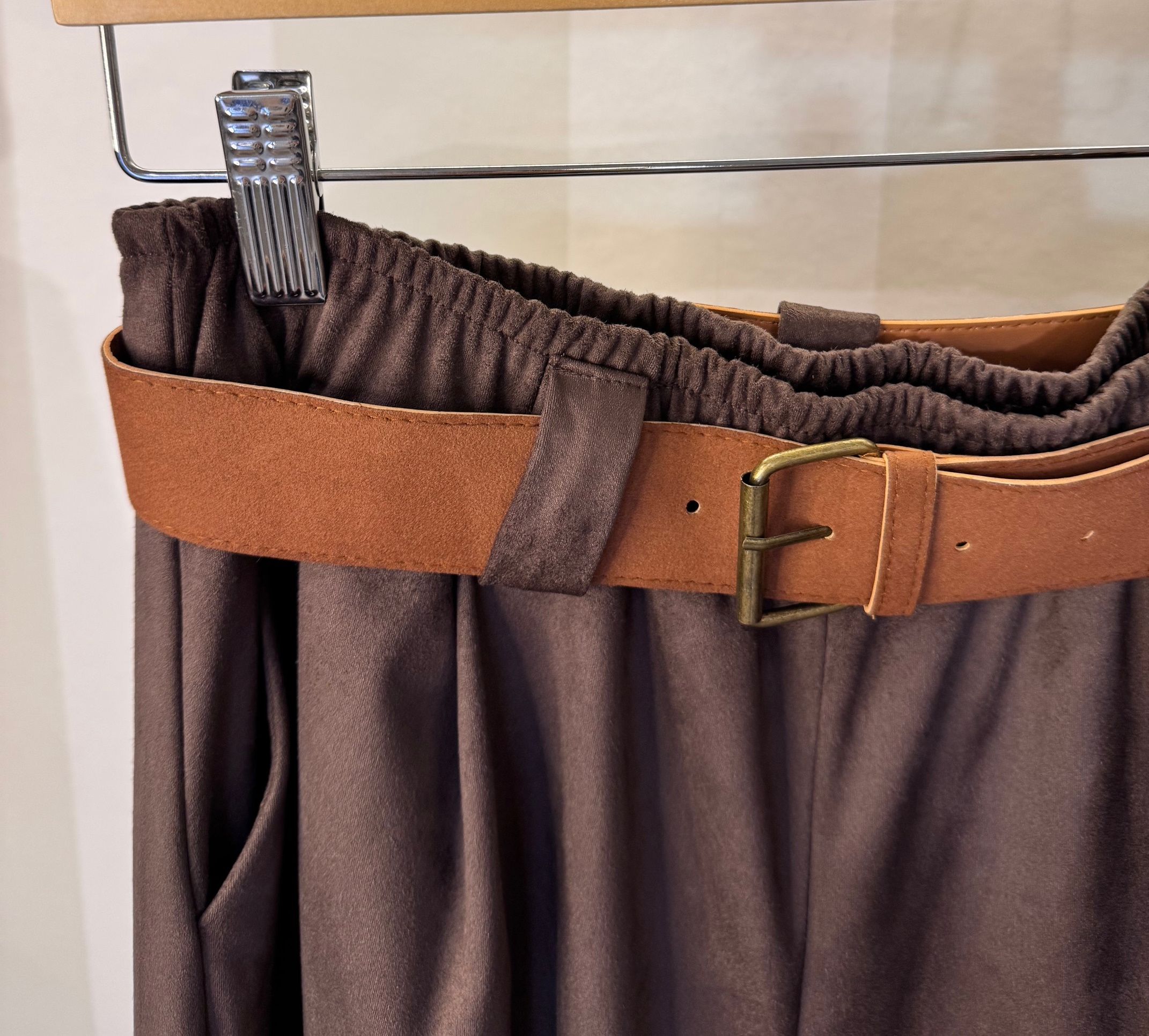 Pantalón de antelina con efecto ante muy logrado. Modelo ancho y corto. Tacto muy suave. Cinturilla elaástica en la parte trasera. Cinturón incluído. Talla única.