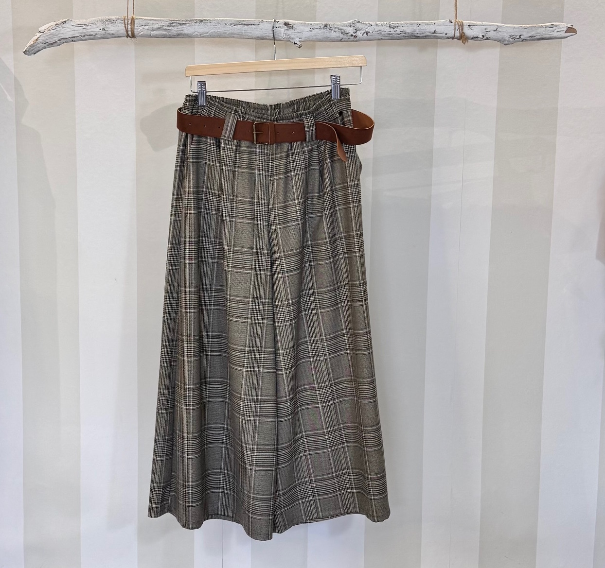 Pantalón corto y ancho con cuadros marrones. Cinturón incluído. Talla única con cinrura elástica.