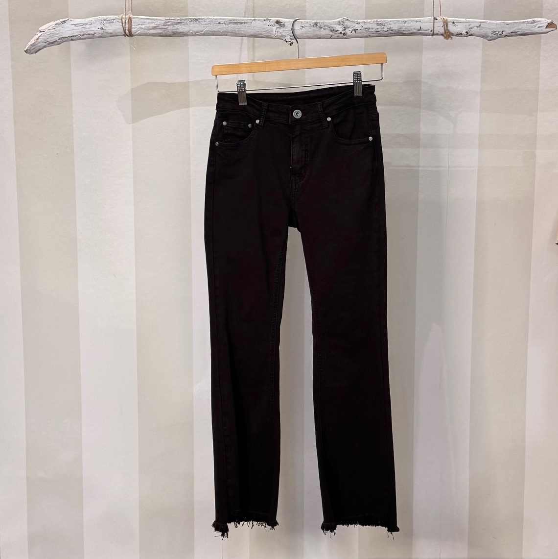 Pantalón cropped con desfilado en la partede abajo. Queda ajustado de pierna y se acampana un poco justo por encima de tobillo. Modelo con bastante elastano.