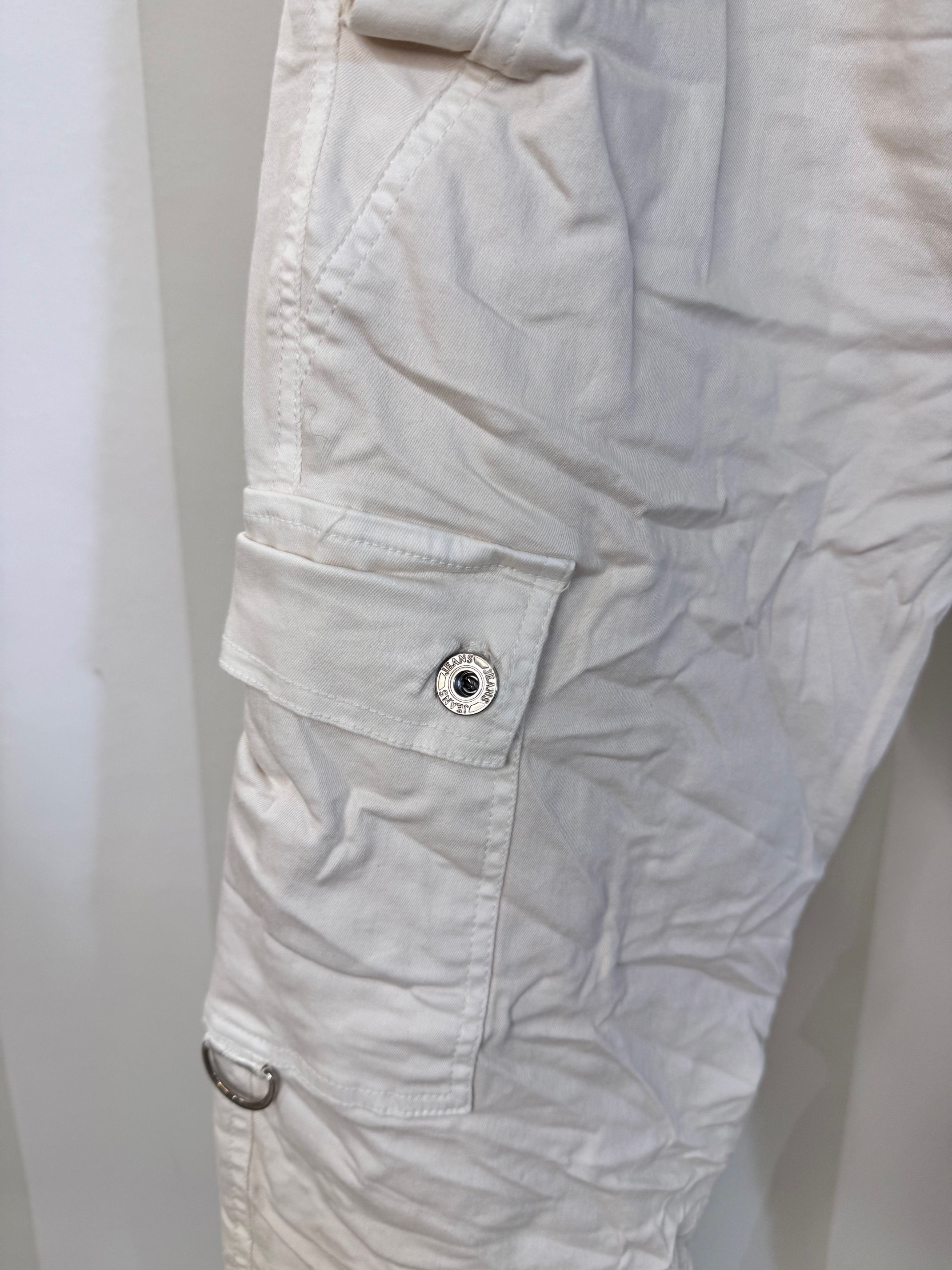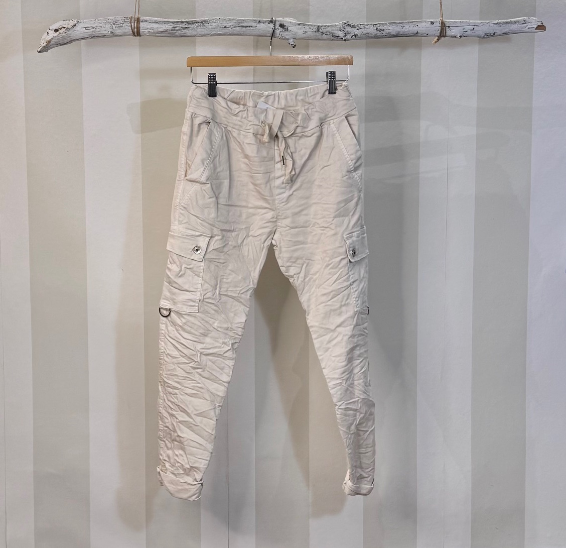 Pantalón cargo con cintura elástica ajsutable. Bolsillos delanteros oblícuos y bolsillos laterales en pierna. Talla única.
